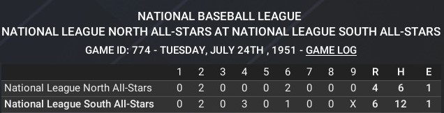 The Baseball Review All-Star Game Rosters Announced July 22, 1951 The votes are tallied and the players have been chosen -- all that's left is to "Play Ball"! It's time once again for the midyear classic, where the league's premier performers come together to show their skill and talent. The All-Stars from the National League North and the National League South are set to tangle to determine which league is the best. The roster for the National League North is: SP Oscar George (SHF) - 3-7, 4.00 ERA, 99.0 IP, 1.37 WHIP, 4.3 K/9, 2.2 WAR SP Brian Haynes (LIV) - 11-6, 3.09 ERA, 160.1 IP, 1.35 WHIP, 3.1 K/9, 2.9 WAR SP Nicolas Legg (MAN) - 8-9, 4.07 ERA, 148.0 IP, 1.42 WHIP, 3.1 K/9, 3.1 WAR SP Dennis Macdonnell (LDS) - 10-6, 2.26 ERA, 147.2 IP, 1.19 WHIP, 3.4 K/9, 3.7 WAR SP James O'Toole (MAN)* - 13-5, 2.82 ERA, 159.1 IP, 1.20 WHIP, 3.9 K/9, 4.3 WAR SP Alexander Shaw (SHF) - 7-10, 3.88 ERA, 146.0 IP, 1.42 WHIP, 4.9 K/9, 3.7 WAR RP Robert Jackson (LDS) - 1-2, 2.11 ERA, 38.1 IP, 1.04 WHIP, 2.8 K/9, 0.3 WAR CL Gavin D'Arcy (LIV) - 4-1, 8 SV, 1.72 ERA, 31.1 IP, 1.31 WHIP, 4.3 K/9, 0.1 WAR CL Gerard Marks (LDS)* - 3-5, 12 SV, 2.39 ERA, 52.2 IP, 1.18 WHIP, 4.4 K/9, 1.6 WAR C Joey Casey (MAN)* - .244/.318/.347, 193 AB, 4 HR, 81 wRC+, 0.3 WAR C Patrick Dowell (LIV) - .264/.291/.382, 220 AB, 5 HR, 2 SB, 80 wRC+, 0.6 WAR C Charles Harrington (SHF) - .289/.337/.389, 149 AB, 2 HR, 97 wRC+, 0.6 WAR C Carl Neumann (LIV) - .375/.420/.537, 80 AB, 3 HR, 165 wRC+, 1.1 WAR 1B Maurice Dougherty (LIV) - .285/.367/.416, 221 AB, 6 HR, 119 wRC+, 0.9 WAR 1B Tyler Hardy (LDS)* - .294/.374/.435, 269 AB, 7 HR, 2 SB, 126 wRC+, 1.6 WAR 1B Colin Thompson (SHF) - .297/.343/.495, 182 AB, 8 HR, 128 wRC+, 0.8 WAR 2B Phil Cooper (MAN)* - .299/.394/.449, 214 AB, 4 HR, 136 wRC+, 1.3 WAR (Injured) 2B Finlay Duncan (LIV) - .293/.397/.452, 259 AB, 5 HR, 137 wRC+, 2.0 WAR 2B Scanlon Ellis (SHF) - .278/.343/.407, 241 AB, 6 HR, 1 SB, 100 wRC+, 1.7 WAR 2B Frank Macintyre (LDS) - .266/.338/.424, 278 AB, 6 HR, 111 wRC+, 1.9 WAR 3B Jake Aitken (MAN) - .309/.358/.439, 278 AB, 5 HR, 10 SB, 119 wRC+, 1.8 WAR 3B Jack Kennedy (LIV)* - .274/.407/.465, 241 AB, 13 HR, 142 wRC+, 2.9 WAR SS Dean Ainley (SHF)* - .237/.297/.369, 279 AB, 8 HR, 1 SB, 81 wRC+, 0.0 WAR LF Matthew Murray (LDS) - .321/.390/.491, 287 AB, 4 HR, 8 SB, 144 wRC+, 2.1 WAR LF James Walker (LIV)* - .272/.359/.438, 283 AB, 4 HR, 5 SB, 119 wRC+, 2.6 WAR LF Jacob West (SHF) - .276/.347/.431, 290 AB, 5 HR, 5 SB, 113 wRC+, 1.4 WAR CF Nicky Aldridge (LIV) - .307/.332/.479, 267 AB, 4 HR, 6 SB, 117 wRC+, 2.2 WAR CF Jack Findlay (MAN)* - .259/.341/.435, 255 AB, 8 HR, 17 SB, 114 wRC+, 2.8 WAR CF David Mitchell (SHF) - .268/.330/.460, 250 AB, 11 HR, 4 SB, 114 wRC+, 0.7 WAR CF Andrew Wilson (LDS) - .248/.325/.445, 218 AB, 6 HR, 110 wRC+, 1.9 WAR RF Robert Green (SHF)* - .356/.428/.508, 191 AB, 4 HR, 3 SB, 162 wRC+, 1.7 WAR The roster for the National League South is: SP James Bayman (NOT)* - 7-7, 3.21 ERA, 148.2 IP, 1.31 WHIP, 3.5 K/9, 3.5 WAR SP Charles Christy (LON) - 6-7, 3.40 ERA, 135.0 IP, 1.32 WHIP, 3.1 K/9, 1.6 WAR SP James Hood (LON) - 10-6, 3.56 ERA, 118.2 IP, 1.33 WHIP, 3.6 K/9, 1.3 WAR SP George Jones (BIR) - 5-5, 2.62 ERA, 89.1 IP, 1.10 WHIP, 4.9 K/9, 2.7 WAR (Injured) SP Reece Macaskill (BIR) - 8-6, 4.14 ERA, 119.2 IP, 1.30 WHIP, 4.4 K/9, 1.2 WAR SP Zachary Sharp (BRI) - 8-7, 4.08 ERA, 128.0 IP, 1.41 WHIP, 2.7 K/9, 1.9 WAR SP John Waghorn (BRI) - 3-2, 2.65 ERA, 115.2 IP, 1.34 WHIP, 3.4 K/9, 2.4 WAR RP Jacob Amary (NOT) - 5-4, 2.06 ERA, 35.0 IP, 1.34 WHIP, 4.4 K/9, 0.7 WAR CL Jack Ferguson (BIR)* - 3-1, 9 SV, 2.27 ERA, 47.2 IP, 1.24 WHIP, 3.8 K/9, 0.7 WAR CL Jayden Werner (NOT) - 4-4, 6 SV, 2.42 ERA, 52.0 IP, 1.08 WHIP, 3.3 K/9, 1.3 WAR C Benjamin Gill (LON)* - .314/.369/.491, 159 AB, 6 HR, 137 wRC+, 1.2 WAR C Richard Jones (BIR) - .242/.343/.335, 182 AB, 4 HR, 90 wRC+, 0.9 WAR C Edward Wilkinson (NOT) - .244/.318/.340, 209 AB, 4 HR, 83 wRC+, 0.6 WAR 1B Chris Allen (BIR) - .306/.367/.444, 252 AB, 7 HR, 10 SB, 126 wRC+, 1.8 WAR 1B Gael Keith (LON)* - .285/.390/.570, 207 AB, 17 HR, 162 wRC+, 2.2 WAR (Injured) 1B Ciaran Pemberton (NOT) - .332/.408/.642, 232 AB, 21 HR, 187 wRC+, 3.2 WAR 2B Jack Cove (LON) - .273/.366/.412, 260 AB, 6 HR, 4 SB, 118 wRC+, 2.2 WAR 2B Max Douglas (BIR) - .301/.363/.454, 229 AB, 7 HR, 4 SB, 125 wRC+, 2.1 WAR 2B Kane Hamilton (NOT)* - .349/.391/.514, 255 AB, 7 HR, 1 SB, 150 wRC+, 2.9 WAR 3B Jude Carroll (LON) - .279/.373/.382, 251 AB, 7 HR, 115 wRC+, 1.2 WAR 3B Toomey Grant (NOT) - .324/.355/.439, 173 AB, 3 HR, 119 wRC+, 1.3 WAR 3B Ellis Johnson (BRI) - .317/.370/.438, 281 AB, 6 HR, 1 SB, 123 wRC+, 2.2 WAR 3B Dylan Moore (NOT)* - .310/.365/.443, 174 AB, 4 HR, 3 SB, 123 wRC+, 2.0 WAR SS Derby Fisher (BRI)* - .251/.326/.448, 259 AB, 12 HR, 8 SB, 111 wRC+, 2.4 WAR SS Samuel Taylor (LON) - .270/.329/.430, 270 AB, 9 HR, 6 SB, 108 wRC+, 1.3 WAR LF Oscar Cookson (LON)* - .278/.379/.479, 263 AB, 10 HR, 6 SB, 136 wRC+, 2.9 WAR LF Robert Mullen (BIR)* - .380/.434/.645, 279 AB, 14 HR, 4 SB, 195 wRC+, 4.9 WAR CF Elliot Fraser (BRI) - .289/.333/.515, 266 AB, 9 HR, 127 wRC+, 2.2 WAR CF Conor Mackie (LON) - .274/.304/.373, 252 AB, 1 HR, 16 SB, 81 wRC+, 1.3 WAR RF Ethan Bretherton (BRI) - .286/.369/.459, 220 AB, 6 HR, 126 wRC+, 0.9 WAR RF Shaun Doherty (BRI) - .230/.335/.339, 239 AB, 2 HR, 10 SB, 89 wRC+, 1.4 WAR RF Joseph Pallett (LON)* - .323/.394/.556, 257 AB, 11 HR, 160 wRC+, 3.0 WAR From the archives of The Baseball Review Last edited by Haystacks; 01-12-2025 at 12:55 PM. |