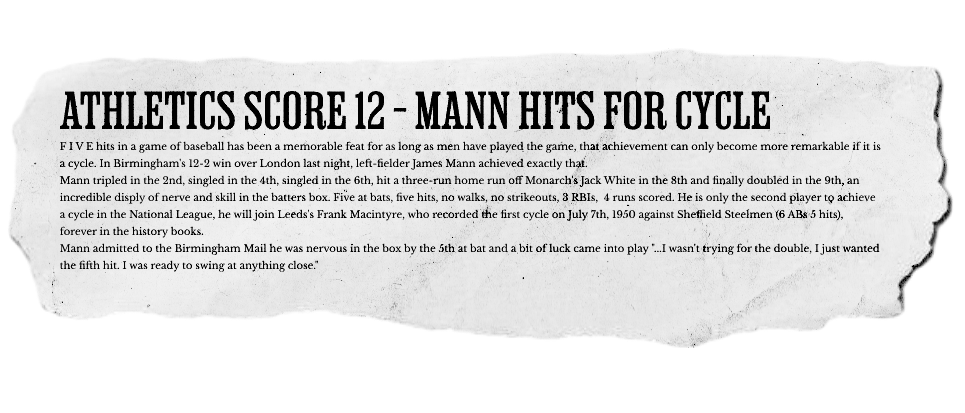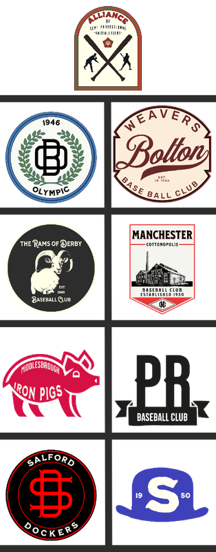 Alliance League Affiliates to British Baseball Association Blackburn Olympic's plans for an alliance of semi-professional clubs lay in tatters. The breakaway of some of the largest semi-pro clubs in the country led by the Hull and Bradford left Blackburn's scheme for a new competition in tatters. The Derby club, claiming to be the heirs to the 1890 professional team formed by Francis Ley, suggested the remaining teams forge ahead, but enter an affiliation agreement similar to what had recently been announced between the Scottish Baseball League and the National and Union leagues. It was an accepted fact that the expansion of the professional leagues would see top talent poached from their clubs without and reimbursement, the best way to prevent this was through affiliation, and on this basis all clubs agreed. In early February, the Alliance League was announced, and their affiliation to the BBA. The clubs remain independent, but any professional club will have to pay a fee of £100 to acquire a player on an Alliance League team's books. ![]() The Clubs (left to right) Blackburn Olympic, named after the short lived association football club of the same name and 1883 FA Cup winners. Bolton Weavers - named for Bolton's strong economic ties to the cotton industry. Derby Rams - no actual connection exists between this club and Francis Ley's, whatever the players, staff and fans may claim. Named for the English folk tale of The Derby Ram. Manchester Cottonopolis - named for Manchester's ties to the cotton industry. Middlesbrough Iron Pigs - named after the town's iron industry. Preston Rifles - named for a former army battalion that went by this name. Salford Dockers - named for Salford's docks, when the ship canal which links Manchester Port (actually in Salford) to the sea opened in January 1894 it was the largest river navigation canal in the world. Stockport Hatters - Named for Stockport's once thriving hatting industry. The production of hats in Stockport will now be in decline as fashion trends begin to change. |