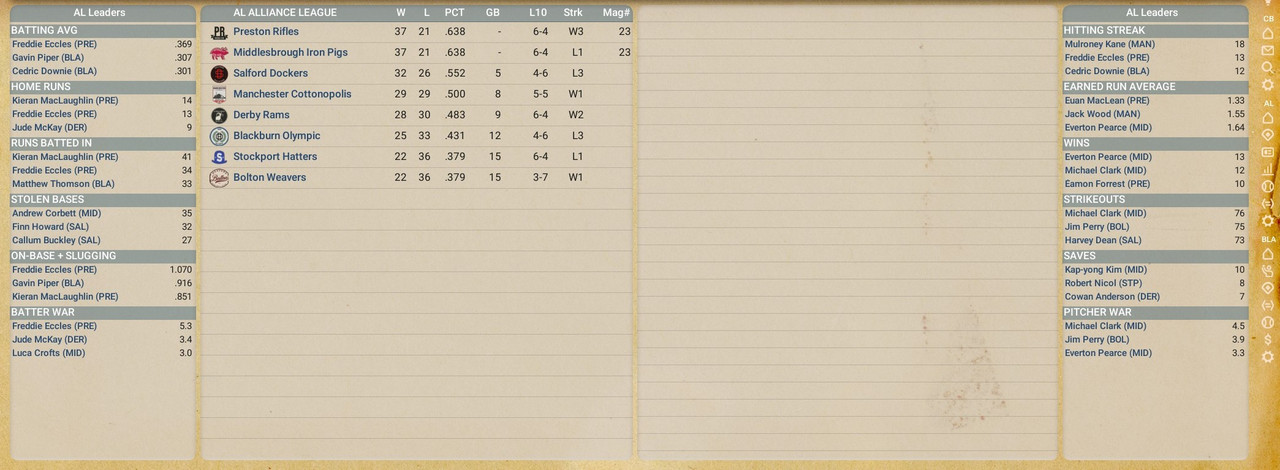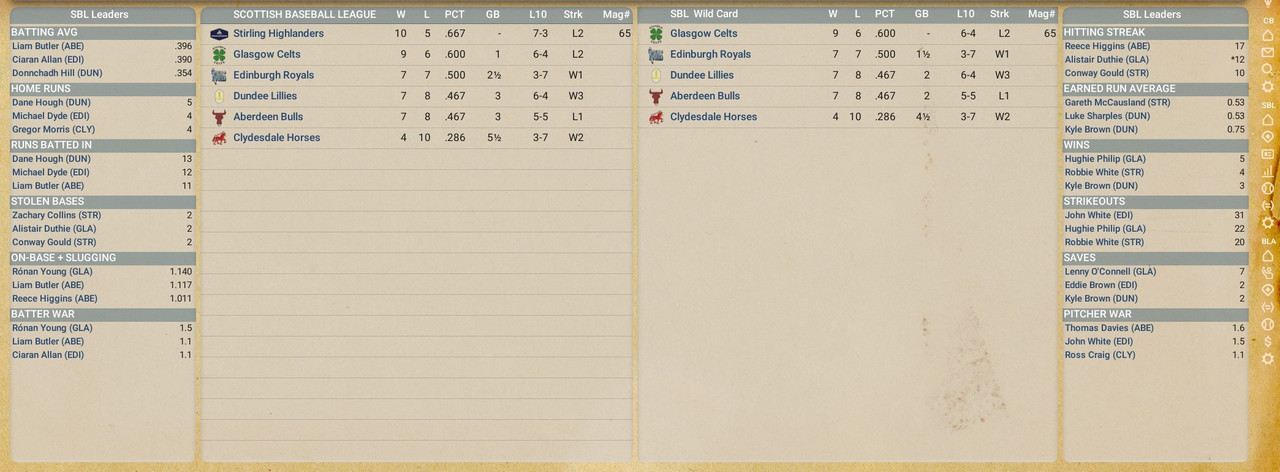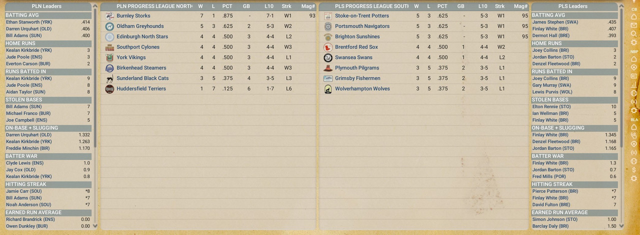 ![]() Standings and Statistics page from The Baseball Review. From The Baseball Review archive The Progress League ![]() The Alliance League ![]() The Scottish Baseball League