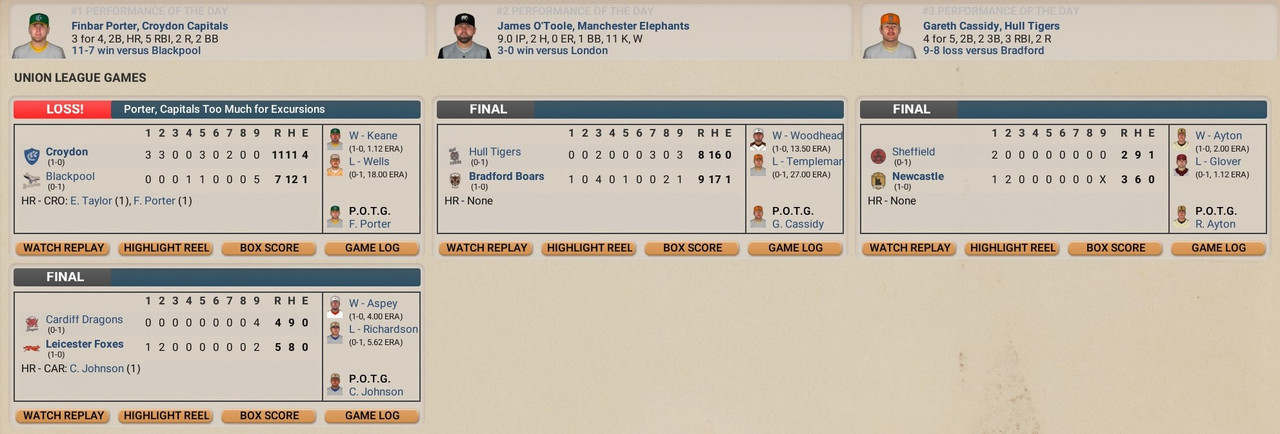 Controlled Expansion Becomes Rapid Expansion During the 1951 winter meeting of club owners and executives of the National League there was some caution in the air as it was announced the league had been approached by a small group of clubs calling themselves the 'Professional Union of Baseball Clubs' requesting acceptance into the National League or they would intend to start their own competing professional league. The expansion for 1952, agreed the previous year, was already to see the league expand by an additional 4 clubs, these being Blackpool Excursions, Leicester Foxes, Cardiff Dragons and Edinburgh Cannons, a 50% increase. The majority of club owners refused to believe their was enough 'high quality' baseball talent to justify further expanding the professional league, there was however an appetite to consume it, as these clubs were regularly bringing in crowds equal to the National League clubs. A suggestion of a promotion and relegation system was quickly rules out, the agreed expansion clubs rejected this out of hand, they'd already been accepted to the National League, they were not going to accept being put in a 'lesser' league for the sake of this new band of club demanding entry to the league. Several owners, saw a perfect opportunity to mimic their inspiration, the Major Leagues. Led by John Moore, the argument was made to allow entry to the 'Union' clubs, but in the form of a separate but equal league. A motion was proposed, the 'Union' clubs would be accepted into an equal league, The Union League. To ensure both leagues had at least one non-English club, the Sheffield Steelmen would be put into the Union League so the National League could accommodate the Edinburgh Cannons. The National League would no longer be split into two regions. The winners of each league would play in the British Championship Series. The motion passed with the required 75% of the vote, only Blackpool and Leicester voted against. The Sheffield club was originally opposed to the plans, until they considered that they should theoretically dominate a league of newly professional clubs... Once those lengthy discussions had finally concluded it was on the considerably easier job of agreeing a schedule. A 132 game schedule was agreed, 6 home and 6 away against the other 7 times in your own league, 3 home and 3 away against the teams of the other sub-league. League games are 6 game series, interleague games are 3 game series, paired in the week against the same team, every Sunday a rest day, (football would not play on Sundays until 1975, I believe). The season would begin the first Monday on or after April 15, and regular season play should span 160 days, ending late September. An All-Star game between leagues would be planned for the season mid-point, inside a week off for rest. Finally the new teams were encouraged to find affiliate clubs to enter into the Progress League, and when word got out, their was no shortage of suitors! ![]() The Clubs The Croydon Capitals - before the formation of the National League, the London district amateur contests had been dominated by the Monarchs or the Croydon club, who's dominance has continued. They regularly draw crowds of at least 10,000 to their games, and their admittance into professional baseball gives London a club on both sides of the river Thames. Ballpark: Capital Field, capacity currently being expanded to 24,000 Progress League Affiliate: Brighton Sunshines Bradford Boars - named after the pub the club was formed in, the Bradford Boars were originally planning to join Blackburn Olympics semi-professional association. However a dispute over a salary cap saw the Bradford Boars and Hull Tigers come together to discuss professionalism Ballpark: Barkerend Road, 18,400 Progress League Affiliate: Burnley Storks Blackpool Excursions - Doris Thompson and Leonard Thompson, owners of Blackpool Pleasure Beach and other amusement parks, had built a ballpark to host the Manchester Elephants Progress League affiliate franchise, on condition they'd get their own club in the National League. Although frustrated about the new league structure, the Thompson's have their professional club and are ready to invest! The club is named after the excursion trains that bring holiday makers from across the north of England to Blackpool in the summer. Although being the smallest professional club in terms of permanent population in their local market, the Thompson's see the holiday market, which brings millions to Blackpool in the summer, as the perfect way to sustain the club. Ballpark: South Shore Stadium, 20,296 Progress League Affiliate: The Thompson's didn't seek out an affiliate, they set up their own, the Southport Cyclones. Another club in a seaside town where the Thomson's own an amusement park, the club is named after the park's premier roller coaster. Edinburgh Cannons - Named after the One O'Clock Gun. Ships in the Firth of Forth once set their maritime clocks by the firing of the gun. The firing dates back to 1861, when businessman John Hewat brought the idea to Edinburgh from Paris. The Edinburgh club have had paid players on their books since 1949 and have dominated Scottish baseball as it has grown. Ballpark: London Road, 15,000 Progress League Affiliate: Edinburgh Northern Stars, named after the Edinburgh Northern Baseball Club, originally founded in the 1890s. Newcastle Knights - I suspect you can figure out how this name came about... The shipbuilding communities of the north-east had embraced baseball during the summer months, the club grew rapidly and even enjoyed the easy access to playing exhibition games in Scotland and northern England. Ballpark: Moor Park, 22,900 Progress League Affiliate: Sunderland Black Cats - named as tribute to both the football club and the Black Cat Battery, where the football club's nickname originates from. Hull Tigers - The Tigers are named in tribute to the nickname for Hull City football club. As stated above they had origi