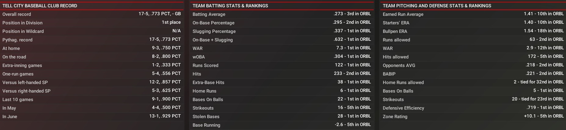October 2, 1871: This one was not in doubt for long, as we built a 3-0 lead within the first three innings, cruising to add on a pair in the eighth as we never let Knob Hill close the gap. We held tough and won this one 5-1, though it was not a big “hitting” series. We outhit them today 6-5, led again by Graham who had two hits and three RBIs, while Centeno added two hits and two runs on the basepaths. Bjornson only gave them five hits and a walk to work with, striking out two as they scored one earned run on him. October 3, 1871: We came into today’s game on the road against Highland (31-91) looking to clinch, as either a win by us or a loss by Troy (70-52) would do the job. We took control quickly, scoring a pair of runs in each of the first, second and fourth innings, but McDonald got shelled in the bottom of the sixth and gave them four runs back to tie it 6-6. Cadenhead took over from there, and we added on a barrage of runs in the top of the seventh, breaking this one back open as we led 12-6 as we went into the stretch. We’d go on to hammer them 15-6 as we guaranteed ourselves a playoff spot in this inaugural ORBL season. Cadenhead got the win, pitching 3.1 innings with four hits and a strikeout, improving to 36-17 with a 2.17 ERA. We outhit them 18-15, led by Steve Hopkins who had four hits, two runs and four RBIs, and Musselman stole his 120th base of the season. Glen Cadenhead will go on the IL for now, since we’ve clinched, to give him time to rest his knee ahead of what we expect to be a challenging playoff run in a few weeks. We’re bringing David Rosenberger and Eric Behmer off the reserve team, making room by sending Izzy Lopez, our backup center fielder, back down. Behmer is going to step in as a third starter, to help give Bjornson a bit of rest in the coming weeks, with Rosenberg as an all purpose reliever -- the 18-year-old has a killer curveball but has not had a chance to show it off yet. October 4, 1871: Eric Behmer started for us today against Highland, and he was quite solid as we hit our way into an early lead and then held it ... up 2-0 after half an inning and coasting to what was eventually a 5-2 win. Behmer improved to 1-1 with a 3.71 ERA, allowing just five hits, a walk and two runs (one earned) with two strikeouts. We outhit them 10-5, led by Centeno who had a hit, two walks, a run and two RBIs. October 5, 1871: Evansville (71-53) is our next stop on the road, as their club leads the Vanderburgh division with a five game lead over Mechanicsville (66-58) in what could be a winner-takes-all division if the rest of the wildcard race holds. This one lived up to expectations, as Evansville built a 3-1 lead on us after four, but we tied it up in the fifth thanks to a two-run single by Centeno. That 3-3 margin held into extra innings, and finally in the top of the 13th we got the lead, thanks to a solo homer by Centeno, his 32nd of the season! Bjornson held them off from there, and we won this one 4-3 in the 13th inning, after outhitting them 11-7. Bjornson allowed just seven hits and a walk with two strikeouts and three (unearned) runs in his 13 innings, improving his ERA to 1.70 through 556.2 innings! Centeno led our offense with two hits, two walks, a run and two RBIs. October 6, 1871: As it often goes with games following tightly-fought battles, this one wasn’t as much of a nailbiter. We took a 2-0 lead in the first, and then managed to stay consistently ahead of them the rest of the way, cruising to win 4-2 while outhitting them 10-9. McDonald got himself a complete game, allowing nine hits and two runs with a strikeout, improving his record to 8-6 with a 2.41 ERA through 59.2 innings. Randy Musselman led the offense with three hits, a steal and two runs scored. October 7, 1871: Our next opponent back on our field in Tell City is Lincoln City (63-63), a team that’s still technically in play for a wildcard spot, though the odds are definitely not in their favor. Behmer gave them a three-run spot in the top of the first, but we made up all the runs quickly, taking a 4-3 lead after two. But Behmer let them slowly climb back in, tying us at 6-6 with an RBI triple by outfielder Josh Bean in the top of the sixth inning, so we went to the bullpen to David Rosenberger in the seventh onward, and it became a shootout from there. In the bottom of the ninth we were able to walk it off with a two-run homer by Centeno, and we won this one 10-9 as a result. Rosenberger gets to start his career with a 1-0 record and a 9.00 ERA, allowing six hits and three runs with three walks in his first three innings of play. And though Lincoln City outhit us 13-11, Centeno was dominant -- THREE HOMERS, an ORBL record, and four hits total, giving him three runs and seven RBIs! October 8, 1871: We had a solid 2-0 lead in this one heading into the seventh, but Bjornson got hit hard for four runs, and with runners on second and third we brought out Rosenberger to get us into the stretch trailing 4-2. We got a run back in the bottom of the seventh but that was all we were able to accrue, and Lincoln City shut us down to win 4-3, snapping our 16-game winning streak (and snapping Bjornson’s 14-game win streak). Bjornson fell to 47-11 with a 1.73 ERA, allowing 10 hits, a walk and four runs (three earned) in his 6.2 innings. They outhit us 12-11, Centeno leading the way for us with three hits, a run and an RBI, including his 36th homer which he hit in the seventh inning as we tried to claw our way back in. October 10, 1871: Darmstadt (60-68) is on the verge of elimination as we head to play them on their field, just a dozen games left in this season. We matched them through three innings, knotted at 2-2, but Darmstadt rolled through the remainder, crushing us 6-2 as they tried to end their season on a good note. McDonald allowed 11 hits, two walks and six runs (five earned) in the loss, and we were out hit 11-5, one of our worst offensive efforts in weeks. Randy Musselman led wit