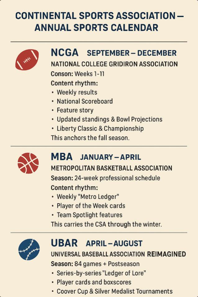 I’ve been posting results and reports from my ongoing Continental Sports Association (CSA) project here for about six weeks now, and I wanted to take a moment to ask for a bit of feedback from those who’ve stopped by. According to the forum stats, the thread has drawn around 1,300 views across 20+ posts which "suggests" about 65 followers, but the more detailed magazines (which I host on FlipHTML5) have shown only a handful of full “reads.” That’s totally fine — I know attention spans and interests vary — but it’s made me curious about what kinds of content people here actually enjoy most. To expand accessibility, I’ve also set up both a Notion page and a Substack site where all CSA materials live together. The idea has always been to build a long-term, multi-sport fictional world, following baseball, football, and basketball in parallel with their real seasons. And for transparency’s sake — my end goal is to transform the 1956 UBAR season into a full novel, combining simulation and storytelling. So, if you have a moment, I’d love to hear from you: Which of the CSA sports interest you most? Do you prefer short summaries, in-depth write-ups, or visual magazine-style reports? Are there things I could adjust to make it easier or more engaging to follow along? Your feedback would be genuinely appreciated — I’m learning as I go, and I’d like to shape this project into something that’s fun to read as well as create. Thanks for humoring the curiosity, — Alan / “AlanOhio”