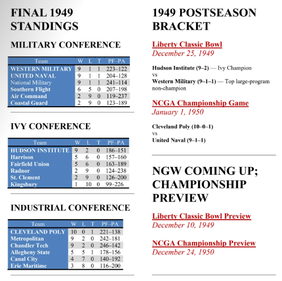 Since we're coming up on the close of the National College Gridiron Association, I thought I would list all our publications about its season for those that might want faster access to the story...