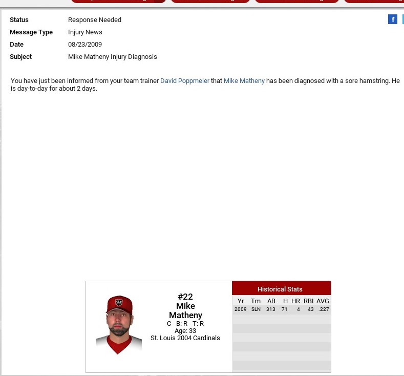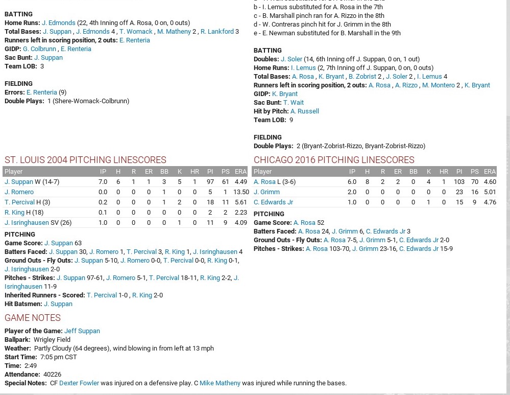 W: Suppan 14-7, 4.49. L: Rosa 3-6, 4.60. Sv: Isringhausen 26, 4.09. HR: Edmonds 22, Lemus 7. Player of the game: Cardinals starting pitcher Jeff Suppan allowed one run on six hits over seven innings. He struck out five and walked three. Note: Cardinals catcher Mike Matheny left the game after being injured while running the bases. The injury is listed as day-to-day. There will be no roster move. Last edited by rink23; 03-13-2018 at 04:34 AM. |