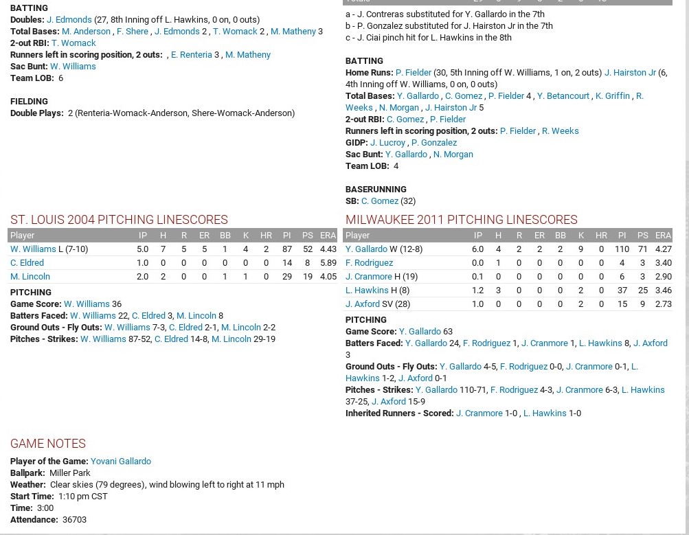 Rec/Std: 58-68, 4th, 12 GB Pittsburgh W: Gallardo 12-8, 4.27. L: Williams 7-10, 4.43. Sv: Axford 28, 2.73. HR: Fielder 30, Hairston 6. Player of the game: Brewers starter Yovani Gallardo allowed two runs on four hits over six innings. He struck out nine and walked two. |