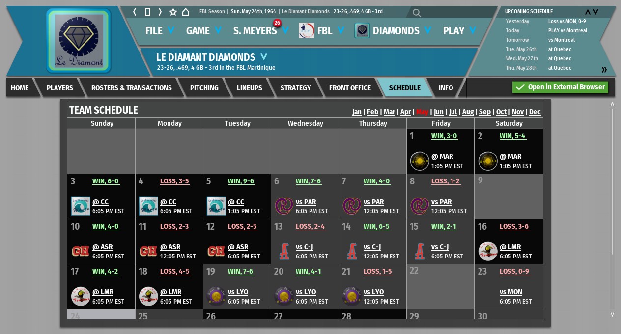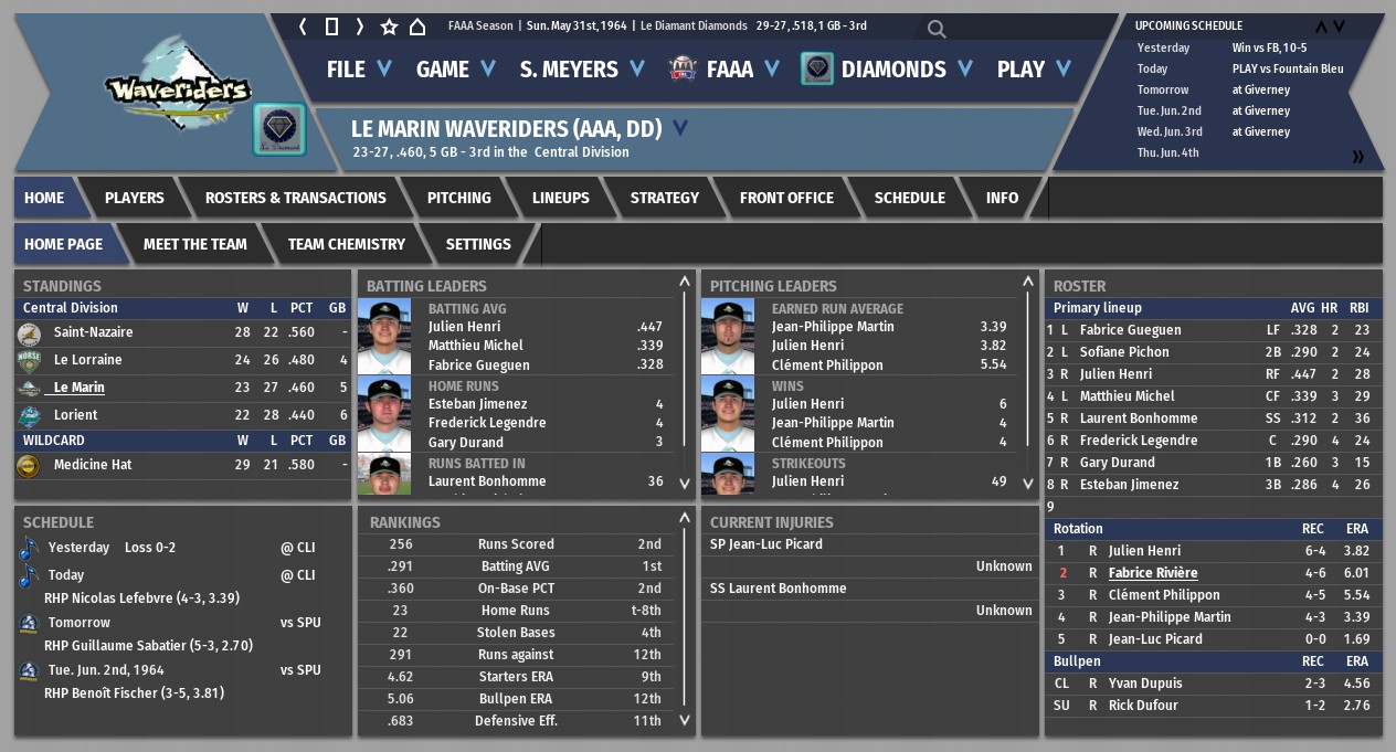 The AAA franchise owned by the Paris Artists is the team we are trying to catch. Strong on the mound, weak with the bat, the Golden Orioles play in a park that promotes high batting averages but limited extra base hits. Feuvrier, a 26 year old journeyman, is probably their toughest out. They will be in town from the 14th to the 16th. Should be interesting.