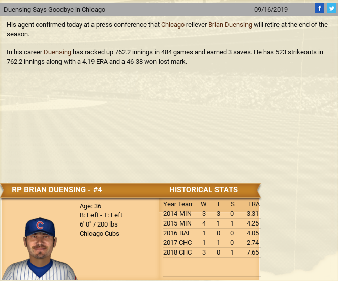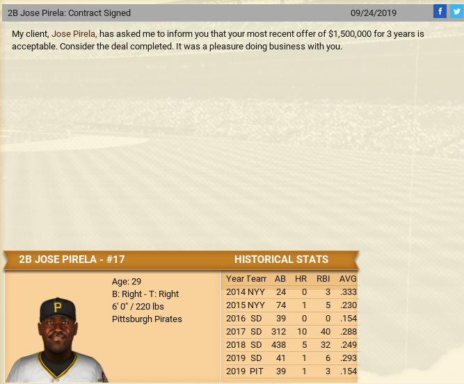 We start a three game series with the Cubs at home, They have locked down the Division already, we may catch a break against them as they rest for the playoffs. We sign 2B Jose Pirela to a three year deal @ $1.5M per. We will still scour the league to find a better solution, but 2B Pirela can be a bottom of the order player as long as he plays good defense. Our AA manager Michael Ryan, has won the Manager of the Year for the AA Eastern League. Congratulations Michael! |