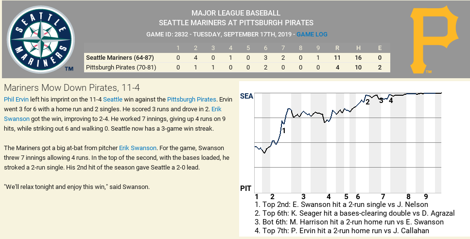 With the results of the last two weeks, and yes I'm noting the injuries here too, I'm just sorry we aren't trying to be more competitive to finish out our season strong. This whole season needs to be evaluated, from the top to the bottom, but it will wait until the season is actually over. SP Jimmy Nelson (4IP, 8H, 5R 4ER, 3BB, 3K's) hasn't been an inspiring pickup so far, I thought the change of scenery would help him. RP Dario Agrazal (2IP, 3ER, 0BB, 2K) has fallen off the cliff here. RP Jaime Callahan ( 1IP, 1H, 2ER, 1BB, 2K) got his first chance as a Pirates reliever and didn't impress too much here. I am remembering he is a AA callup, so I'm not quite throwing in the towel yet. RP Devan Watts (1.0 1H, 1BB, 3K's) has rebounded nicely and his current ERA is back to 2.45, not bad for a high "A" player! CL Archie Bradley (1IP 2H, 1R) was just ok considering the game. Two players had multiple hits, 1B Josh Bell (2/4 1R, 1RBI) and 3B KeBryan Hayes (2/4) produced, but 3B KeBryan Hayes legged out two triples but couldn't be brought home to score either time. CF Monte Harrison's solo hit was a two run jack that made the game 8-4. It was definitely too little, way too late. |