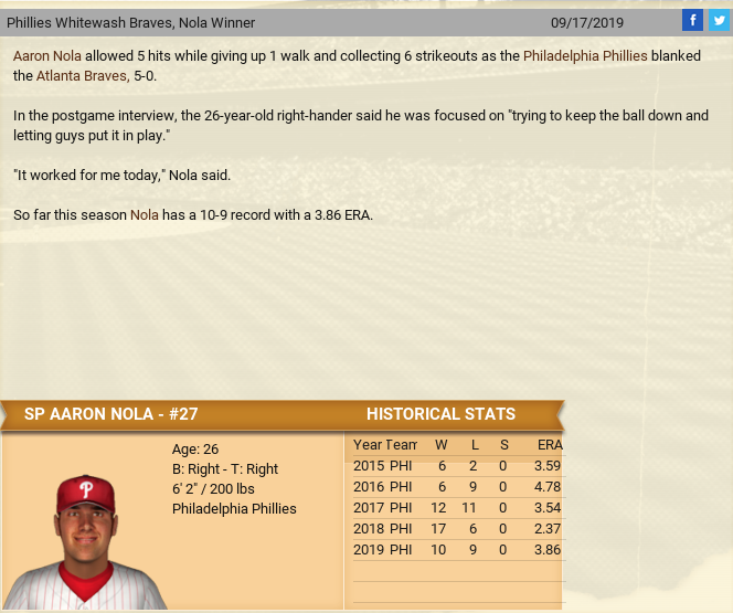 Philadelphia Phillies SP Aaron Nola 10-9 (9IP, 5R, 0R, 1BB, 6K's) shut out the Atlanta Braves 5-0 in a complete game. Arizona Diamondbacks SP Robbie Ray (9IP, 2H, 0R, 2BB, 10K) shut out the Miami Marlins 10-0 in his complete game. Atlanta Braves RP Arodys Vizcaino is out for the season after team doctors found bone chips in his throwing elbow. Vizcaino (2-4, 4.72ERA, 2SV) appeared in 58 games this season. |