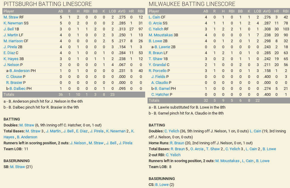 SP Jimmy Nelson (5IP, 7H, 3ER, 3BB, 4K's) pitched well until the 5th inning, when a walk and Christian Yelich's double set up second and third for Brewers 2B Brandon Lowe who stroked a two run single to make it 3-1. RP Corbin Clouse (1.2IP 2H, 2ER, 3BB, 2K's) pitched the 6th and part of the seventh innings where he gave up another two runs to make the 5-1 final score. RP Ryan Brasier (1.1IP, 0H,0R, 0BB, 2K's) came on with 2 outs in the 7th and got the final out to escape the jam RP Clouse left. Pirates got ten hits and only one run, RF Myles Straw (2/5 1R) and SS Kevin Newman (2/5) were the only multiple hit players. RF Straw has been productive as a leadoff batter and is getting multiple hits in a game as much as anyone on the team. |
