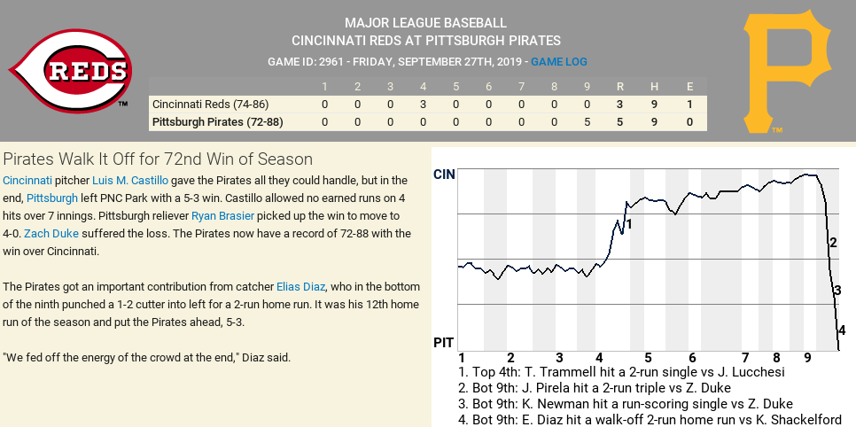 It would be funny except winning is supposed to be enjoyable, this was more like the relief AFTER the dentist is done drilling your mouth. The Pirates again played disinterested baseball for 8 innings and trailing the Reds by 3 runs. Then in the ninth inning they suddenly decide to hit? The Reds relievers suddenly collapse? I don't know what to call it other than thanks to C Elias Diaz's 2 run walk off homer, Pirates win!