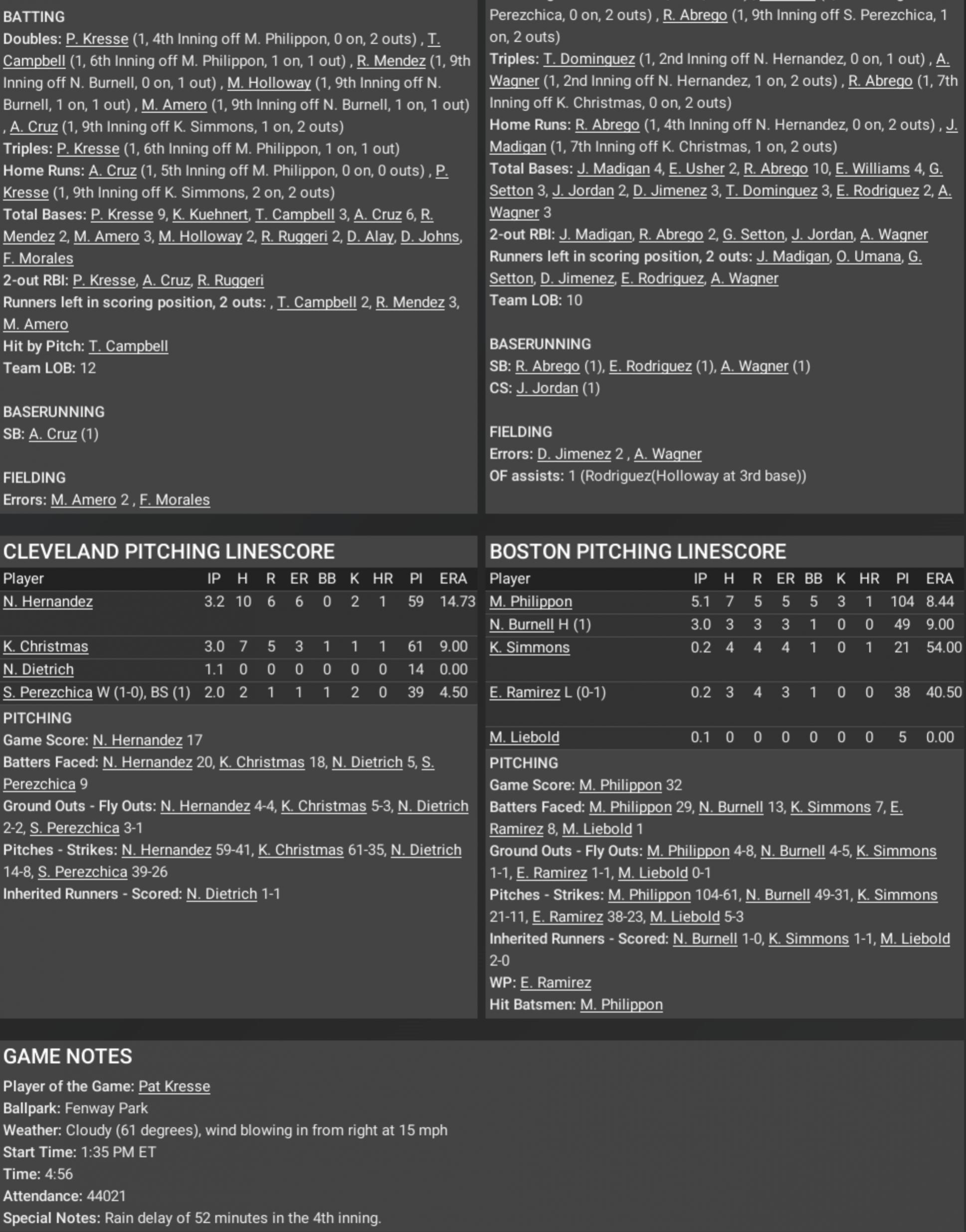 The Red Sox, up 11–5 going to the top of the ninth, looked like the Red Sox that everyone assumed would make the playoffs quietly, confidently. Then along comes Cleveland, a team that, let’s remember, blew a five-run ninth-inning lead in last year’s World Series Game 7, and they orchestrate—literally orchestrate—a miraculous ninth-inning comeback of their own. Seven runs, mind you. Seven runs. Cleveland takes a 12–11 lead. And you think it’s over? You think Boston’s cycle-hitting Ricky Abrego, who had already hit for the cycle today, would be able to get them out of the hole? Of course not. The Red Sox rally to tie it. Extra innings. But here’s the kicker: two Boston errors in the 10th allow Cleveland to score four more. Four. Four runs. Game over. 16–12. The Indians walk off, Red Sox fans are in therapy, and Ricky Abrego… the guy who went 4-for-6, hit a homer, a triple, a double, scored three, drove in two—he’s left with a memory that is glorious personally, and absolutely bitter professionally. Let’s break it down: Pat Kresse for Cleveland—home run, triple, double, four RBIs, two runs scored. He is the reason this game exists in your nightmares tonight. And Alex Cruz? The first baseman with the clutch double in the top of the ninth? He’s the punctuation on a sentence that reads: “Cleveland is not done. Cleveland will never be done.” This game is about history repeating itself, not history teaching a lesson. The Indians—who last year were one out and one strike from a championship—once again force us to confront that momentum, belief, and chaos matter more than talent on paper. And the Red Sox? They’ve got the numbers. They’ve got the heroics. They’ve got the rookie-of-the-year-level talent in Abrego. But in the playoffs, sometimes the baseball gods aren’t fair. Sometimes, they just remind you that clutch is the only stat that matters. So here’s the takeaway: Cleveland leads the series 1–0, and if you thought last year’s Game 7 was unforgettable, you just got a reminder that history is a cruel teacher. |