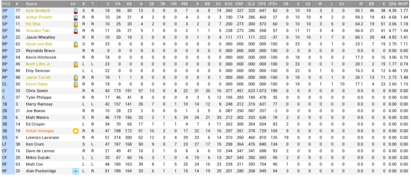 …but especially gone were a pair of 28-year-old outfielders from AAA, neither of them hitting even .200 with the Alley Cats this year, and neither of them having had much success in various stints with the big league team. It had only been four games for Eddy Veloz (.111, 0 HR, 0 RBI), but Oscar Rivera had collected 279 PA across three seasons, batting .225 with 9 HR, 35 RBI. The homers were nice, but they weren’t enough to make him relevant. Raccoons (32-32) @ Blue Sox (25-38) – June 16-18, 2054 Over in Nashville, the Blue Sox were having troubles scoring… well… they were scoring 4.2 runs per game, but that was the second-worst mark in the Federal League. By comparison, the Coons were 7th in the CL with just over 4.3 runs per game. The Blue Sox were ninth in runs allowed, and the Coons had taken two of three games when these teams had met last season. Projected matchups: Seisaku Taki (5-5, 4.20 ERA) vs. Travis Baker (3-6, 4.55 ERA) Jason Wheatley (3-7, 4.26 ERA) vs. Felix Alvarez (4-6, 4.07 ERA) He Shui (5-6, 3.04 ERA) vs. Rafael Mendoza (2-6, 5.26 ERA) The Raccoons skipped Brobeck on the off day on Monday, and on Tuesday would face the Sox’ only left-hander, Travis Baker. Brobeck was in the lineup for that occasion, however. Game 1 POR: LF Venegas – SS Lavorano – C Gowin – 1B Crum – 2B Waters – 3B Brobeck – RF Cox – CF de Lemos – P Taki NAS: CF E. Flores – RF Sayre – 1B Ale. Ramos – C Cantu – SS Nye – LF Pfeifer – 3B Lundberg – 2B Malkus – P T. Baker Both teams went through the order once in just two innings, but frantically stranded three runners each before Venegas hit a single to begin the third inning and stole second base. He was singled home by Lonzo for the game’s first run, but Lonzo was then left on second base. Craig Sayre hit his way to second base with a double in the bottom 3rd, stole third base, but was stranded there with a pop to Waters from Alejandro Ramos, and a fly to de Lemos by Jose Cantu. Dave de Lemos also robbed Mike Pfeifer of a drive to deep center in the fourth inning, but the Blue Sox finally clawed their way back into a tie in the fifth inning. Sayre reached base, stole second base this time, and was singled home by Ramos to get even on Taki. A home run to left by Ken Crum, a Brobeck triple (!) and Ryan Cox legging out a 2-out infield roller for an RBI single gave the Coons a 3-1 lead, but there had been just way too much traffic on Taki, who had needed 95 pitches through five frames, and then saw Nick Nye reach on an infield single to begin the bottom 6th, then walked Pfeifer in a full count. The Coons went to Hitchcock with the tying runs on base, and Hitchcock eviscerated the bottom of the order to suffocate those tying runs. Four outs from Eloy Sencion followed before the ball went to Valentino Prada, which was bold to begin with. Prada surrendered three singles on seven pitches, retired nobody, and when he went to the clubhouse found all his worldly belongings stuffed into the nearest trash bin and a note by me on the locker advising him to get the **** out. The Raccoons went to Bak with the bases teeming in a 3-1 game, and he got the Coons out with a lead, surrendering one run but striking out Edwin Flores to get the Coons out of the damn inning. The Raccoons would not tack on a run in the ninth despite singles by Cox and de Lemos, then handed the ball to Daley against the 2-3-4 batters. Sayre grounded out to Waters. Ramos struck out. Cantu hit a fly to deep right and … nah, Cox had that one under control. 3-2 Raccoons. Brobeck 2-4, 3B; Cox 2-4, RBI; Valentino Prada (0-0, 5.40 ERA) ended up on waivers, as if anybody would take him. The Coons would have a look at the #8 pick from 2051, left-hander Matt Walters, who sadly hadn’t panned out as a starter, and had made 21 relief appearances in AAA so far. He had a 4.50 ERA, but also a .404 BABIP. He was striking out 12.3 per nine innings. That gave us three left-handers in the pen, but I was willing to have him see some big-league righties with those numbers. That curveball was a real bender! As a sign that Prada wasn’t gonna be back, his number #24 went to Walters straightaway. He did however not arrive rested and would not make his debut until Thursday at the earliest. Game 2 POR: 3B Venegas – SS Lavorano – C Gowin – 1B Ramsay – LF Crum – RF Cox – 2B Waters – CF Puckeridge – P Wheatley NAS: CF E. Flores – RF Sayre – 1B Ale. Ramos – C Cantu – SS Nye – LF Pfeifer – 3B Lundberg – 2B Malkus – P F. Alvarez Sayre singled, stole another base, and scored on Nick Nye’s single with two outs in the first, putting Wheats in a 1-0 hole, but the Coons would counter their game in the third inning, getting two guys on, two steals, and two runs. Pucks and Lonzo did the stealing; the latter singled home the former, and then was himself singled in by Chris Gowin. Ramsay then hit a double in the gap, but Gowin had to be stopped at third base, and Ken Crum grounded out rather harmlessly to end the inning. Not that Nashville didn’t answer: Edwin Flores hit a leadoff single off Wheats in the bottom 3rd, stole second, and was singled in by Sayre, who then was finally caught stealing. Matt Cox’ leadoff jack in the fourth put the Raccoons on top again, 3-2, but Pfeifer answered with a leadoff single in the home half of the inning and then took off for second. Gowin threw him out, too, just ahead of a Tyler Lundberg homer that tied the game, but didn’t give the Sox the lead now. Cox struck out after the 3-4-5 batters all hit 2-out singles to load the bases in the top 5th, and that was probably bad news for Wheats, who looked like it was April all over again and didn’t fool anybody, really. Through five innings, he held a 3-3 tie, barely, but struck out only two batters, and that included Alvarez once (the other being Cantu). Alvarez struck Matt Waters with a 2-2 pitch to begin the sixth inning. Pucks flew out, but when Wheats bunted his w