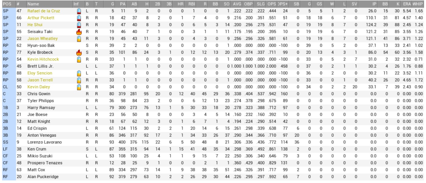 I tried to find a left-handed second baseman still, but the problem was that the personnel just wasn’t there. There were stars that didn’t suit as injury fillers (think, Jonathan Ban, Ivan Villa), and then there were scrubs that made Matt Knight look like a sensible solution. The exception was perhaps Sergio Quiroz, but he had such a princely deal with the Stars that I wasn’t gonna touch that: $3.5M per year through ’56. All Star Game He Shui started the All Star Game for the Continental League, but got clubbed for three hits and a 2-run homer by the Warriors’ Julio Moriel. Since the game would go back and forth quite a bit in an eventual 6-5 Federal League win, he didn’t take the loss. That one would hang on the Elks’ Dan Lawrence, who was bailed out by Brett Lillis jr. in the eighth inning. The Coons’ batters had mixed days. Chris Gowin started behind the dish in an all-Portland starting battery, but went 0-for-3. Ken Crum entered the game as a pinch-hitter and socked an RBI double. Raccoons (47-42) @ Titans (40-49) – July 16-19, 2054 Four in Boston then, with the Raccoons bringing a 6-2 lead in the season series to town. The Titans were still second from the bottom in runs scored, but the Raccoons’ lackluster offense had helped them inch up to ninth place in runs allowed by now. Still fifth in the division, though. Mario de Anda and Adriano Chavez were injured and not available for them. Projected matchups: Jason Wheatley (7-7, 3.77 ERA) vs. Jose Arias (5-6, 4.47 ERA) Rafael de la Cruz (1-1, 4.43 ERA) vs. Jamie Guidry (8-7, 3.99 ERA) He Shui (8-7, 2.46 ERA) vs. Kenneth Spencer (3-2, 3.02 ERA) Arthur Pickett (6-7, 4.51 ERA) vs. Chad Shultz (3-2, 3.33 ERA) One, two, THREE left-handers out of the All Star Game, and then the righty Shultz. Hey, Titans – at least gimme a Southpaw Sunday! Game 1 POR: LF Venegas – SS Lavorano – 1B Crum – C Gowin – 3B Brobeck – 2B Knight – RF Puckeridge – CF de Lemos – P Wheatley BOS: CF Whitlow – C Salas – RF D. Gonzalez – 1B L. Rodriguez – LF E. Cobb – SS Marroguin – 3B J. Lopez – 2B Perriello – P J. Arias Wheats got the first start after the All Star Game after being rained out of the last start before the All Star Game, and gave up the first run after the All Star Game with a Raul Salas single and an RBI double for Dave Gonzalez in the bottom 1st. The single-double pattern repeated in the bottom 2nd with Jordan Marroguin and Jon Lopez, 2-0, while the Raccoons didn’t manage to land an outfield single until the fourth inning, although Lonzo hit a pair of infield singles in the first and fourth innings. He was stranded the first time, but Brobeck singled him home with a ball to center and two outs the second time ‘round, getting the Critters on the board. Top 5th, Arias smacked Dave de Lemos’ paw with a fastball, and from the way he jumped up and down screaming we early on had a hunch that it was bad. Dr. Padilla quickly removed him from the game, with Mikio Suzuki taking over centerfield duties. Suzuki stole second base, Arias walked Anton Venegas, and Lonzo had his third single of the game, this one over Marroguin for a game-tying RBI single. Crum flew out to left to end the inning after that. The Coons took the lead in the sixth with a leadoff double by Chris Gowin, a wild pitch, and a run-cashing groundout for Brobeck, the ol’ slugger. Wheatley hit a single in the seventh, which led nowhere, then got stuck in the bottom of the inning. Josh Garris and Raul Salas went to the corners and two outs. Dave Gonzalez would be met by Eloy Sencion, except that Eloy Sencion was now bet by right-hander Angel Gonzales, batting 9-for-25… or 26, after he grounded out to Brobeck to strand the runners. The Raccoons also found the corners in the eighth, but with nobody out; Alex Diaz walked Crum, who dashed to third base on Gowin’s single to left-center. From there, Brobeck drew a walk to fill them up, which was certainly lead to no runs. Harry Ramsay batted for Knight, but grounded into a 1-2-3 double play, while Pucks grounded out on a 3-0 pitch to strand the other two runners. ******* *******. Larry Rodriguez drew a walk off Sencion to begin the bottom 8th, putting the tying run on base right away, but Kevin Hitchcock suffocated the rally attempt with two strikeouts and a pop once he entered the game. The Raccoons didn’t find an insurance run, but Daley retired the first two batters, Bill Perriello and Matt Gilmore, without issue in the ninth. Eric Whitlow made himself a bit of an issue, falling to 1-2 before hitting a liner into the gap – but there came Pucks, and Pucks came just in time to snatch the ball, ending the ballgame…! 3-2 Raccoons. Cox (PH) 1-1; Lavorano 3-5, RBI; Gowin 2-4, 2B; Wheatley 6.2 IP, 7 H, 2 R, 2 ER, 2 BB, 3 K, W (8-7); Roster move, as de Lemos went to the DL with a broken thumb that would cost him at least a month. Trent Brassfield was hitting .275/.381/.419 in AAA as a 21-year-old, but he was not a centerfielder and was more likely a September addition. The Raccoons instead brought up Prospero Tenazes, who was Prospero Tenazes… Game 2 POR: 3B Venegas – SS Lavorano – LF Crum – C Gowin – RF Cox – 2B Knight – CF Tenazes – 1B Philipps – P de la Cruz BOS: CF Whitlow – C Salas – RF D. Gonzalez – 1B L. Rodriguez – SS Marroguin – 3B J. Lopez – LF Weir – 2B Perriello – P Guidry Eight pitches in, the Coons had two runs on the board as Venegas doubled, scored on Lonzo’s single, and Lonzo stole a base, reached third on a bad throw by Salas, and scored on a groundout by Ken Crum. The Raccoons got Crum and Gowin on base in the third inning before Matt Cox found a double play, while the Titans tried to counter in the bottom 3rd after getting nobody on base in the first two innings. Hector Weir hit a gapper for a leadoff triple and de la Cruz walked Perriello to put the tying runs on the corners. Guidry popped out, Whitlow struck out, and Salas… hit an 