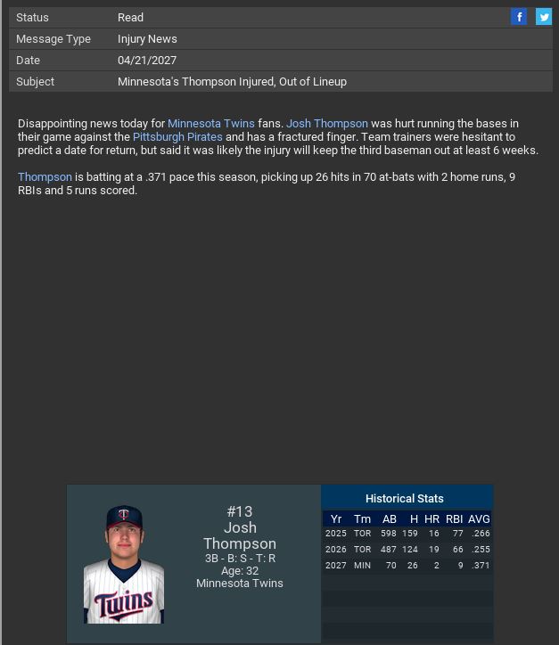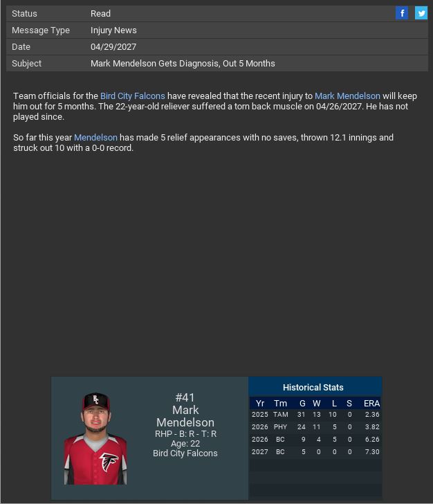 Cubs lose SP Carlton Dukes for the season. Springfield Cardinals lose RF Ray Savard for 6 weeks. Red Sox SP Satchel Paige pitched a CG SH. Cloud City SP Jim Page pitched a CG SH.