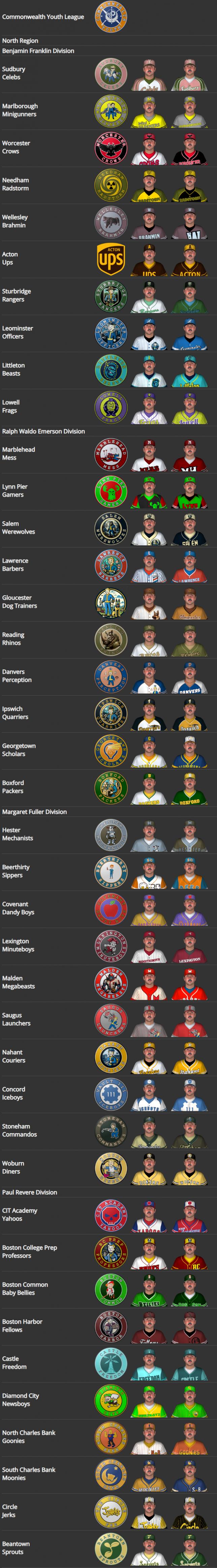 BNN Report News from the CBO, Minors, CCBL, and CYL by Nat Wright-Kawolski 7 November 2316 CYL Now a League of 132 The Commonwealth Youth League has welcomed 16 more teams and two new divisions, the North Region's Etahn Allen Division and the South Region's Thomas Mayhew Division. Most of the new teams joined the new divisions, but there were some movements and four teams joining pre-existing divisions in the NR's Longfellow Division and the SR's Bradberton Division. Teams joining the NR's Longfellow Division are the Ogunquit Trolls and the Old Orchard Sandstalkers. In the Bradberton Division, the new teams are the Pittsfield Festies and Lee Aisons. New members of the Allen Division are the Bennington Zappers, Wilmington Snowmounts, Brattleboro Banshees, Keene Quills, North Adams Miners, and Greenfield Glowcaps. The Manchester Rocketeers and Nashua Zoologists also joined the Allen Division. Both of those teams were in the W.E.B. DuBois Division in 2316. In the Mayhew Division, the teams joining are the Nantucket Marsh Hawks, Martha's Vineyard Fleet, Naushon Island Radsharks, Falmouth Cool Beans, Oak Bluffs Hoppers, and Marion Howlers.The New Bedford Whales and Wareham Comets moved from the Crispus Attucks and Samuel Morse divisions, respectively, to joing the Mayhew. The Sherwood Manor Sasquatch are now going by the town name of Enfield (CT) Sasquatch. The Brown Bubblers ceased operation out of the Brown University campus because of the university's expanded higher education offereings in Providence and a new state-of-the-art facility being built near Murray Stadium. Players for the Bubblers joined the Woonsocket (RI) Orphans for the 2317 season. Models of all teams' logos and uniforms below.