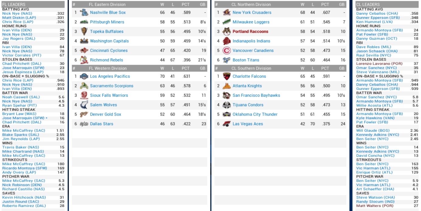 Last week before the All Star Game, and the Raccoons would begin it by hosting the last-place Titans in the first half of this year’s four-and-four. Boston ranked second from the bottom in runs scored with a pathetic .235 team batting average, and sixth in runs allowed. Somehow that added up only to a -17 run differential. The key to scoring was to get their starters out of the game, since their pen was basically a collection of holes and fireworks, with an ERA almost a full run worse than the starters. The Raccoons had swept the Titans in the first meeting of the year, four games to zip. Projected matchups: Sean Sweeton (8-4, 2.73 ERA) vs. Kodai Koga (7-6, 3.02 ERA) Kennedy Adkins (8-6, 2.81 ERA) vs. Victor Scott (2-3, 6.45 ERA) Seisaku Taki (7-7, 3.58 ERA) vs. Ryan Musgrave (5-7, 4.31 ERA) Ramon Carreno (0-1, 4.67 ERA) vs. Medardo Regueir (6-6, 3.07 ERA) Scott and Regueir were left-handed pitchers, just to mix it up a bit. Game 1 BOS: 3B Torrence – LF Ma. Gilmore – RF Whitlow – CF Weir – SS Sowell – C Burkart – 1B I. Santiago – 2B B. Andrews – P Koga POR: 1B Callaia – SS Lavorano – CF Abercrombie – LF Brassfield – RF Puckeridge – C Chavez – 2B Labonte – 3B Anderson – P Sweeton While Sean Sweeton faced the minimum the first time through despite giving up two singles – Ethan Torrence got himself caught stealing and Brent Andrews was doubled up by Koga swinging with two strikes – the Raccoons would score 2-out run(s) in each of the first three innings against Koga, beginning with Brassfield’s RBI triple to drive in Abercrombie in the first inning. In the second, Chavez and Labonte got on base with leadoff singles and Gaudencio Callaia drove in Chavez with a 2-out single, while in the third it was three quarters of a natural cycle with two outs as Pucks singled, Chavez doubled him home, and then Labonte ripped another 2-out RBI triple to extend the lead to 4-0. Boston walked Richard Anderson intentionally, and Sweeton grounded out. Through four, Sweeton had hardly any trouble, then spontaneously walked the bases full with Hector Weir, who stole two bases, Ken Sowell, and Bruce Burkart. But last-place teams are gonna last-place, huh? Israel Santiago popped out to Pucks in shallow right, and then both Andrews and Koga went down on strikes to strand all the runners. Koga responded with leadoff walks to Chavez and Labonte in the bottom 5th, and the Raccoons made a 2-out run from that with another RBI single by Callaia, but Lonzo grounded out, getting to 0-for-4 in just five innings as his slump deepened radically. The Coons kept scoring regardless; Koga was knocked out after a leadoff single to center by Abercrombie in the sixth, and against Jim Peterson the runner stole second and then came home on a Brassfield double, 6-0. Walks would however not quite leave the Coons staff alone in this game; Sweeton would offer five in total across seven shutout innings, and Ricky Herrera walked Eric Whitlow and Weir with two outs in the eighth. Mike Lane replaced him, fell to 3-1 against Sowell, but the shortstop then flew out to the warning track in leftfield and Abercrombie. 6-0 Raccoons! Callaia 2-5, 2 RBI; Abercrombie 2-4, BB; Brassfield 3-4, BB, 3B, 2B, 2 RBI; Chavez 2-3, BB, 2B, RBI; Labonte 2-3, BB, 3B, RBI; Sweeton 7.0 IP, 3 H, 0 R, 5 BB, 5 K, W (9-4); Game 2 BOS: LF Weir – 3B B. Andrews – RF Whitlow – SS Sowell – C Burkart – 2B J. Watson – 1B Ma. Gilmore – CF Torrence – P V. Scott POR: 1B Callaia – SS Lavorano – LF Brassfield – CF Caballero – 3B Brobeck – C Chavez – 2B Bribiesca – RF Royer – P Adkins Brobeck came close to a 3-run homer in the first inning, but Whitlow noisily crashed into the fence in rightfield and made the catch to end the inning, and instead the Titans went up in the top of the second, getting straight singles from their 8-9-1 hitters against Adkins, who had already been wonky in the first inning, went on to nick Andrews, and then barely escaped when Whitlow popped out to Callaia in foul ground to end the inning. Arturo Bribiesca homered the game tied in the bottom 2nd, but the Titans scored two unearned runs in the top 3rd. Adkins not having it was one thing, but Brobeck starting the entire inning with a 2-base throwing error to put Ken Sowell on second base led to a bit of a cascade and RBI singles for Jonathan Watson and Ethan Torrence. Adkins would only pitch five innings, taking 105 pitches to make it that far, and had the bases loaded again in the fifth before Scott stranded everybody with a pop to Bribiesca. Adkins gave up seven hits and three walks against three strikeouts in a forgettable outing. Bottom 5th, 1-out singles by pinch-hitter Richard “Dean” Anderson and Callaia put runners on the corners. Lonzo obliged to at least get a run home with a grounder to second base, but full counts to Brassfield and Caballero after that yielded only a walk and a strikeout and no decisive breakthrough. It was still a 3-2 game when Caballero came up with two outs again in the bottom 7th, this time with Callaia doubling and Brass drawing another walk against Scott, who was still pitching to Caballero, but this time gave up a game-tying single on a 2-2 pitch, which ended his day. Southpaw Matt Otte then rung up Brobeck to end the inning. Tanizaki got five outs and Sencion collected four more in the meantime to hold the game close, and the latter got in line for the victory in the bottom 8th. Otte retired Chavez on strikes, but gave up a single to Bribiesca. Sencion was batting eighth and replaced with Abercrombie, who grounded out, but Pucks, inserted earlier into the #9 spot in a double switch, snuck a single through the right side to send Bribiesca home to score from second base. Matt Walters then had little trouble to end the game in the ninth inning. 4-3 Coons! Callaia 2-4, BB, 2B; Bribiesca 2-4, HR, RBI; Anderson (PH) 1-1; Puckeridge 1-2, RBI; Game 3 BOS: 3B Torrence – LF Ma. Gilmore – CF Weir – S
