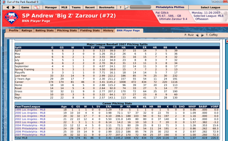 The negotiating was tough for awhile. He really played hard ball and turned down some pretty sweet offers. This last one really was going to be my final one and fortunately he said yes to it ... (and the fans told me they loved us for signing him)... I could be in trouble in a few years when a lot of my guys are set to become FAs and likely will command big bucks. But I'll enjoy things while I can ... Maybe Zarzour's Phils can be like the real Phils and win a World Series in 2008... My biggest fear now is that Andrew's ratings tank (though he technically should be in his prime). If he goes south I'm stuck with a HUGE contract for awhile ... fingers crossed...