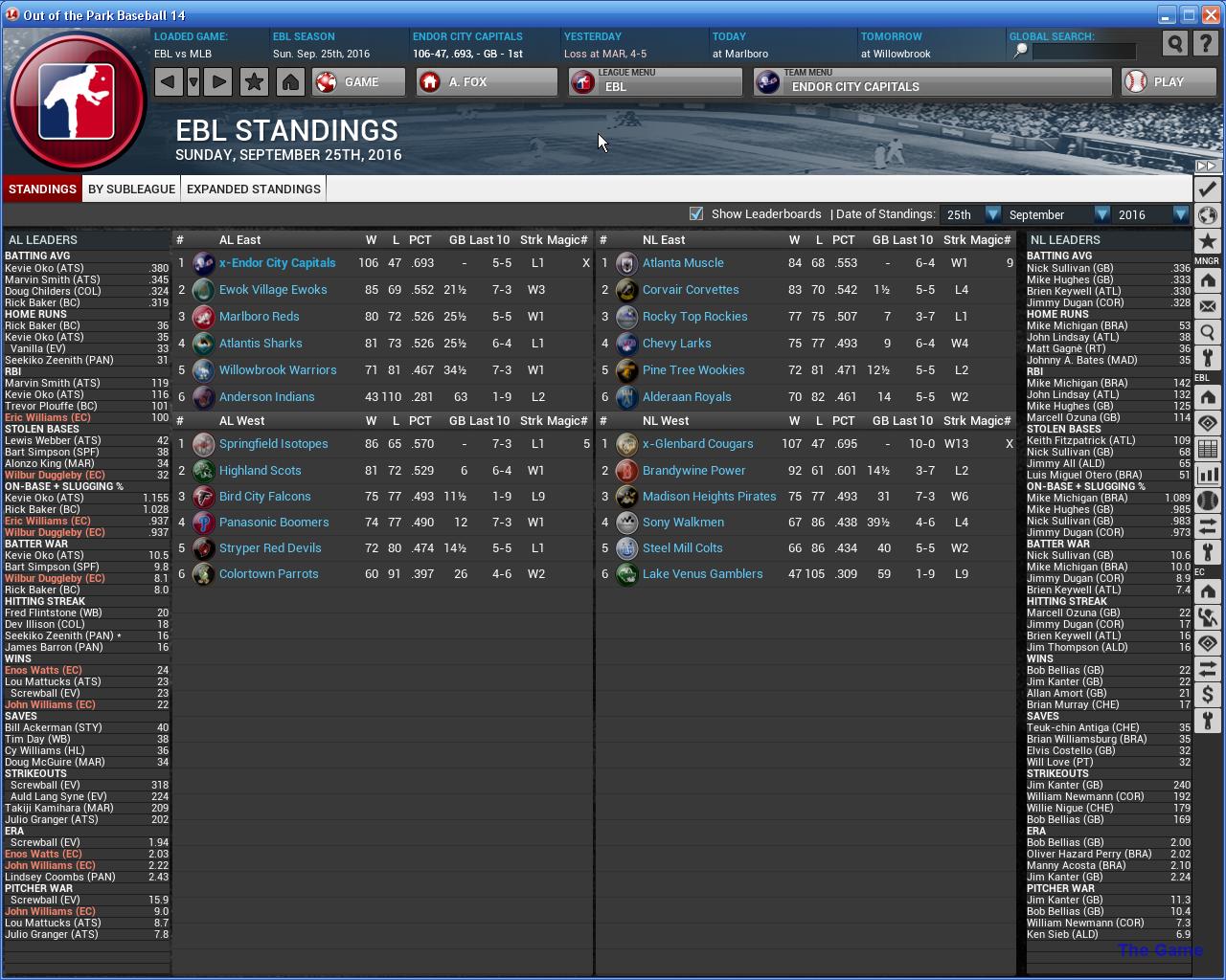 Nick Sullivan won the NL Batting Title. Both are front runners for MVP. Anderson avoiding being the most loss team in the history of the EBL. The 2010 Highland Scots were 45-117. The 2007 Rock City Rockies were 30-114.