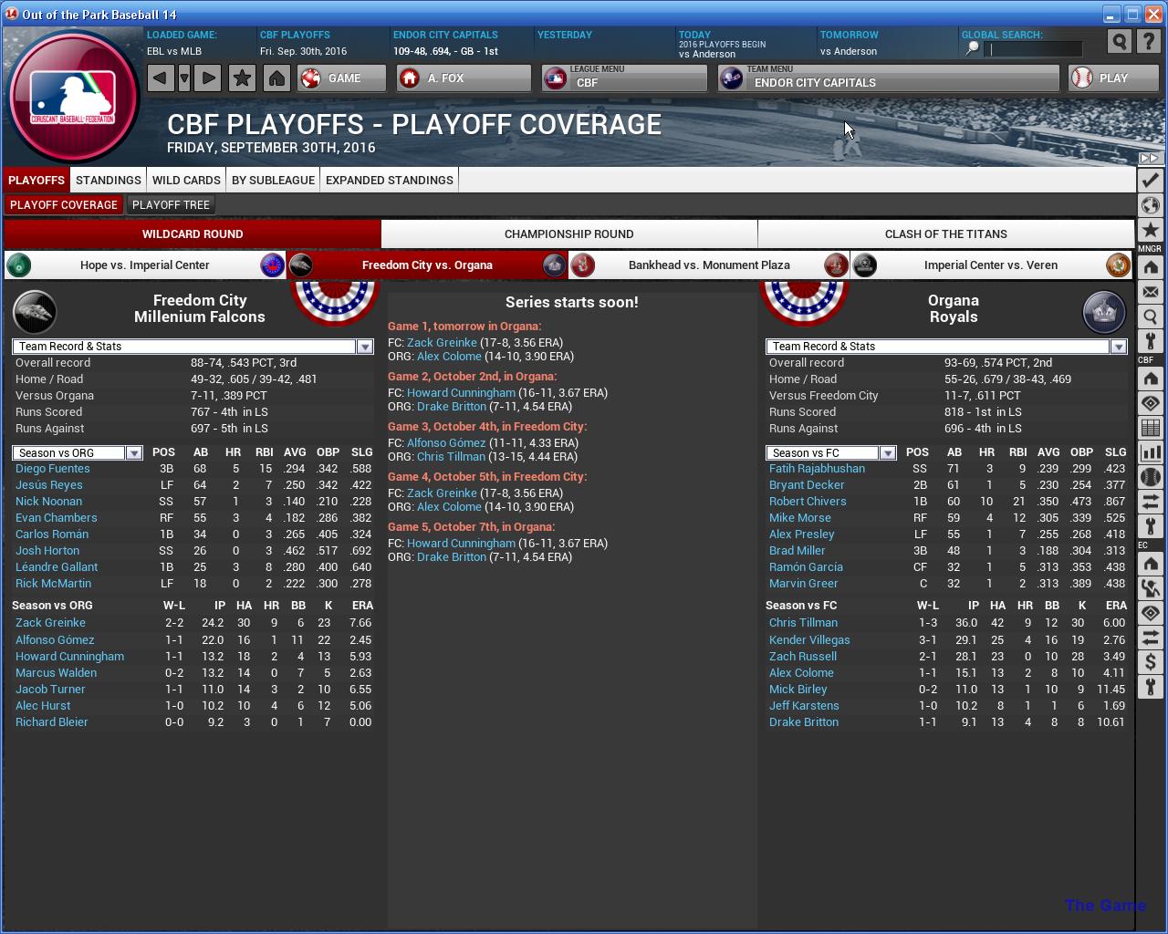 September Callups: CF Brett Scott-Bremer .463 38 HR 137 RBI 172 BB 57 SB (AAA) SS Richard Urena .338 7 HR 47 RBI (AAA) LF Avery Bentley .338 35 HR 142 RBI (AAA) 3B/RF Brian Compton .297 13 HR 91 RBI (AAA) SP RHP Joe Alston 12-7 5.30 163 IP 143 K (AAA) SP LHP Erick Hurtado 9-8 5.10 144 IP 107 K (AAA) MR RHP Bill Moriarty 10-2 1 SV 4.22 111 IP 90 K (AAA) 0-3 6.11 28 IP 19 K (EC)
