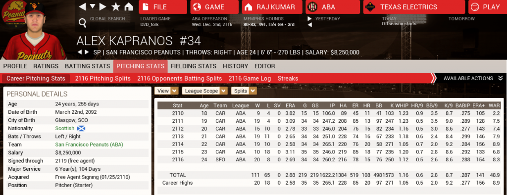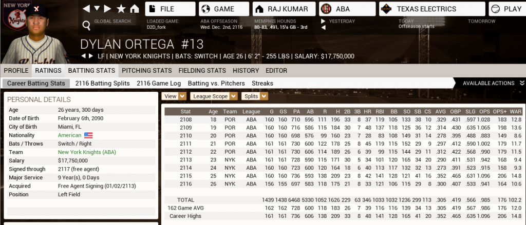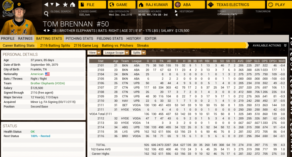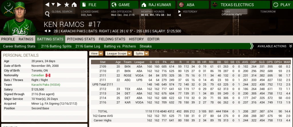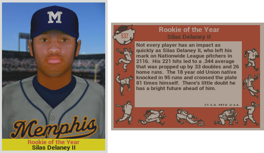 OF Shovel Bryant (Ramzavail) OF Jack Donovan Jr. (jdono927) OF Joshua Rohatyn III (laptophound) SS Tom Brennan (Rurik) SS Carlos Martinez (baseballonly) OF Dylan Ortega (captaincoop17) 2B Ken Ramos (heshinymew64) SP Alex Kapranos (deandean1998) OF Joe Peters IV (jpeters1734) IF Steve Kuffrey (Steve Kuffrey) 2B Paul Scott (baseballonly) OF Silas Delaney II (Eugene Church) ![]() ![]() ![]() ![]() (Ken Ramos won 3 Gold Gloves in the ABA) ![]() Shovel Bryant was an all-star in his rookie season. ![]() ![]() ![]() ![]() ![]() ![]() ![]() ![]() ![]() ![]() Sidenote: I cut the modifier for financial coefficient in half from .500 to .250, so salaries all got dropped by 50% so don't be alarmed. I was kind of tired of them being so high. |