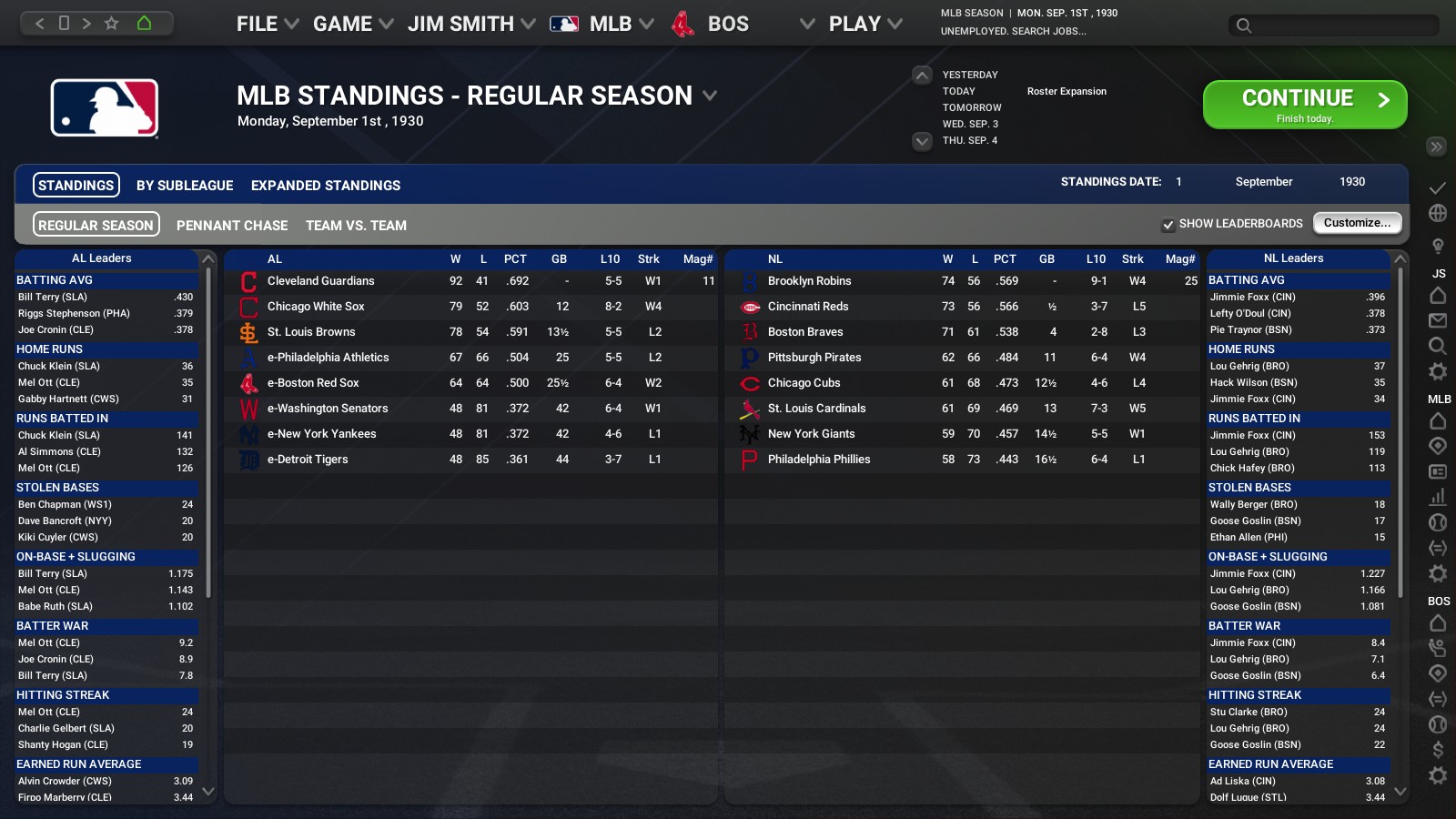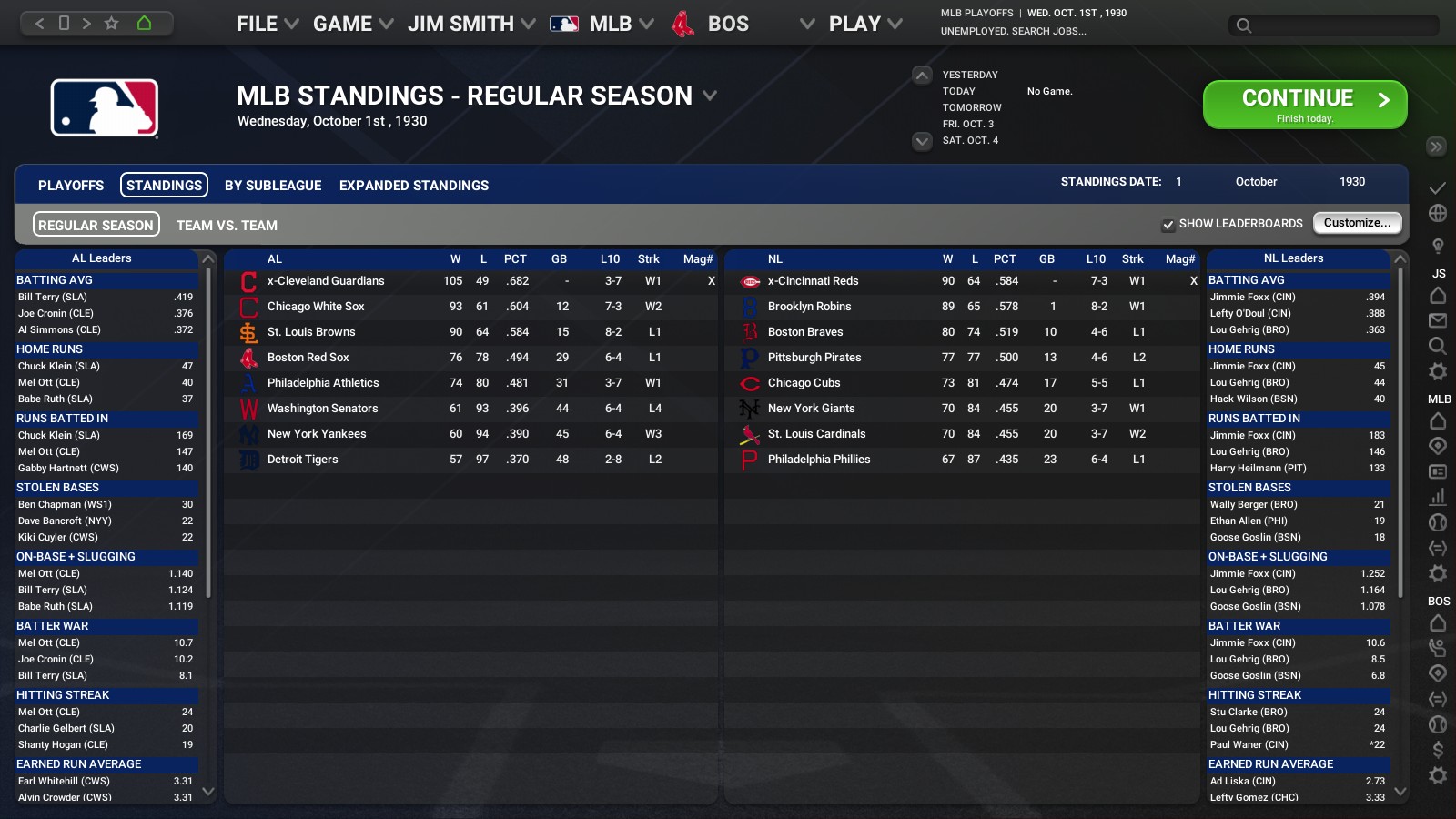 Awards for September and baseball standings at the end of the 1930 regular season