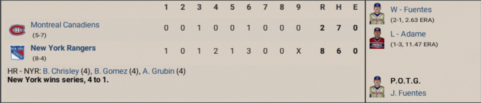 This is a rematch of the 1984 Finals in which the Wild swept the Rangers 4 games to 0. |