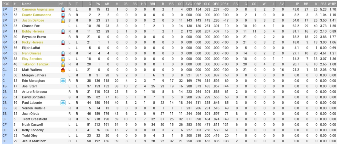 The Coons took their 5-game losing streak home and hoped that as few people as possible would witness the acceleration of sucking harder and harder. The Aces had also started fairly well but by now were in their usual death spiral. They led a lot of offensive categories, including the entire team slash line stuff, but their pitching was positively woeful and they weren’t better than 6th in any pitching or defensive team stat. Still a +15 run differential, but like the Critters, they were working their way downwards. Portland was up on the season series, 2-1. Projected matchups: Justin DeRose (3-4, 3.59 ERA) vs. Scott Evans (4-5, 3.26 ERA) Ramon Carreno (1-1, 2.70 ERA) vs. Ray Benner (3-3, 5.12 ERA) Bobby Herrera (7-5, 3.13 ERA) vs. Larry Broad (5-6, 4.62 ERA) Vegas had only right-handers to offer, and Carreno was not on the roster as of Monday. We still had to figure that one out. Game 1 LVA: CF Ambriz – SS Veguilla – 3B A. Alfaro – RF Austin – LF Hummel – C Burgio – 2B Chairez – 1B Jacinto – P S. Evans POR: 2B Labonte – 3B Benitez – CF Caswell – LF Brassfield – 1B Starr – RF Martinez – C Lathers – SS Bean – P DeRose Alex Alfaro whacked a 2-run homer off DeRose, three batters into the game, which was not exactly the best start to a week, ever. The Raccoons came back quickly, though, singling Evans to death; three in the first, three in the second – hits, not runs. Runs they had three in total. Starr in the first and Labonte and Caswell in the second hit the RBI singles for it. Martinez and Lathers hit a pair of singles in the bottom 3rd before the lovely Portland summer interrupted proceedings with a 45-minute rain delay, on the other side of which Aubrey Austin singled and Casey Burgio doubled him in to tie the score at three off a very punchable looking DeRose. And if I had a dime for every time the Aces’ offered trading Casey Burgio (.365, 11 HR, 46 RBI) to us for any assorted crap in the last two years, I could afford one of those $24 hot dogs now. Things then slowed to a crawl as neither team managed to finally topple the other’s pitcher, although DeRose was hit for (to no measurable result) in the bottom 6th. The Raccoons got four outs from Alex Rios, then another meltdown from Eloy Sencion, who walked and/or beaned the bases full in the eighth inning before yielding for Reynaldo Bravo, who was just as useless in giving up a tie-breaking 2-out, 2-run single to left to Curt Goodwin. Gustavo Jacinto filled the bases again with another single before Tony Villarreal finally ended the miserable inning with a strikeout. 5-3 Aces. Labonte 3-4, RBI; Starr 1-2, 2 BB, RBI; Lathers 2-4; Forbes Tomlin (.250, 0 HR, 0 RBI) returned to St. Pete to make room on the roster for Ramon Carreno, who had to go on short rest, but at this point we didn’t particularly care about his body parts, which was a stark thing to say about a 24-year-old, but it was also stark for a 24-year-old to already be as much scorched earth as Carreno was… Game 2 LVA: CF Ambriz – SS Veguilla – 3B A. Alfaro – RF Austin – LF Hummel – C Burgio – 2B Villarreal – 1B Jacinto – P Benner POR: 2B Labonte – 3B Benitez – CF Caswell – LF Brassfield – 1B Starr – RF Martinez – C Monaghan – SS Bean – P Carreno Two walks, two hits, a wild pitch, and two runs, and that was just the top of the FIRST inning for Carreno, who was loopy from the get-go, and it never got better. Occasionally he got the defenders to stand in the right places, but then there was the fourth inning, which began with Ken Hummel getting nicked and a Tony Villarreal double to center, and then seamlessly continued with a 2-strike single to left for Jacinto, who drove in two more runs. Carreno didn’t have a strikeout yet, and wasn’t gonna get one from Benner, either, who dropped a single to left on a 3-1 pitch, which surprised even the runner from second base, who didn’t get around to score. Jose Ambriz’ groundout brought home Jacinto, and Miguel Veguilla flew out to Martinez, but it was now a 5-1 game. “1” because the Coons had scored a run on a balk by Benner, which was wholly too embarrassing to even talk about anymore… Benner walked everything with legs and/or brains, which in our case was mostly legs. Monaghan and Labonte drew free passes in the bottom 4th, which gave Benner six walks issued on the day, but nobody could drop in a base knock and the runners were stranded on first and second. Alex Alfaro’s solo homer extended the score to 6-1 in the fifth, which was the last inning for Carreno, who was put straight on the bus to the airport. The real funny bit was how he outlasted Benner, though, who put Starr and Martinez on in the bottom 5th, including his seventh walk, then gave up an RBI single to Monaghan an was yanked before five innings were completed. Jon Bean then duly made the third out of the inning against Adam Eutsler. And then the Coons tied the game. Bottom 6th, down 6-2, Eutsler walked Vernon Hudalla batting for Carreno, which was near-inexcusable. Labonte forced out the runner, but Benitez singled and then Cas hit one into the gap for a 2-run double. Brass whiffed, but Joel Starr socked a game-tying 2-out homer. We also stayed even in this inning and the seventh, although Jose Cintora allowed singles to Monaghan and Labonte and threw a wild pitch, but Tony Benitez struck out to strand them in scoring position. Cintora further loaded the bases in the eighth: Brass walked, Starr got brassed, and Martinez hit a scratch single to left. Monaghan was up with one out and new pitcher Andy Younge throwing righty. We fetched Konecny, who hit a sac fly, which in this situation was good enough, but Jon Bean added a 2-out RBI single for good measure before Lathers struck out. Matt Walters resisted the urge to blow up and put the game away to end a 6-game losing streak. 8-6 Coons. Benitez 2-5; Caswell 2-5, 2B, 2 RBI; Monaghan 2-3, BB, RBI; Bean 2-5, RBI; Maud, who is Jon Bean a