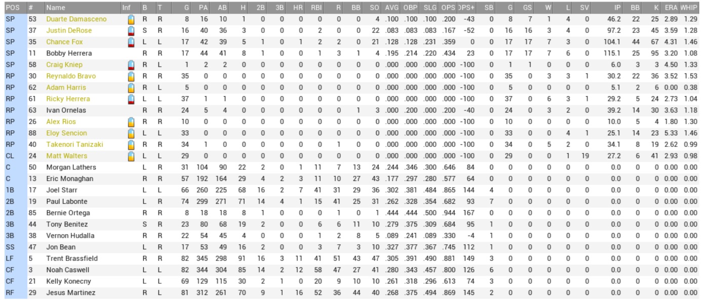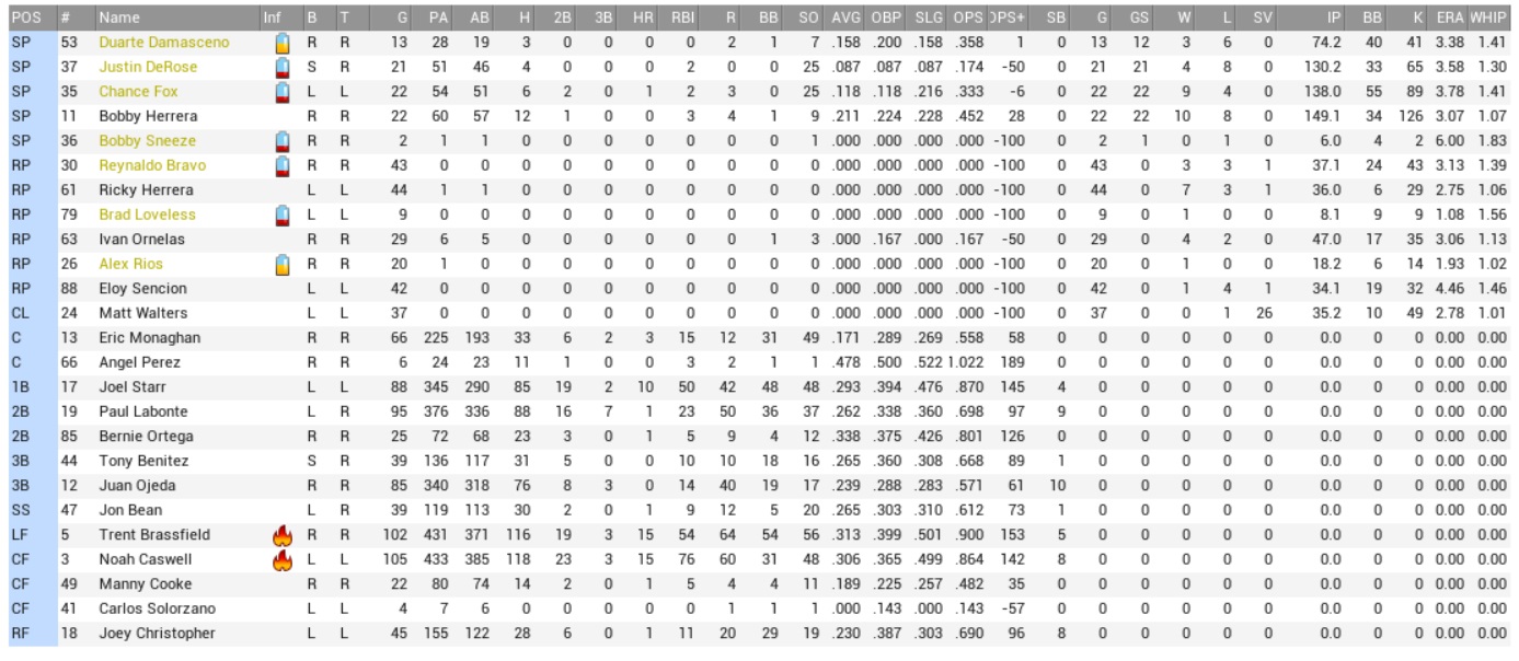 The Warriors were tops in the FL West, one game up after six straight wins. They had a very good defense and were tops in OBP, which helped them to second in runs scored, although their pitching was rather average. They had a +57 run differential, though. We caught them without outfielder Elmer Maldonado, but apart from that they didn’t have too many injury complaints. This was the third straight year these two teams met in the regular season. Last year, we had won two of three games. Projected matchups: Duarte Damasceno (0-1, 2.84 ERA) vs. Evan Alvey (2-4, 3.52 ERA) Chance Fox (6-2, 3.73 ERA) vs. Phil Baker (6-3, 3.21 ERA) Justin DeRose (3-4, 3.44 ERA) vs. Phil Nelson (5-4, 4.11 ERA) Alvey was the only left-hander in the Warriors rotation. Game 1 POR: SS Bribiesca – 3B Ojeda – LF Brassfield – CF Caswell – RF Martinez – 1B Starr – C Monaghan – 2B Hudalla – P Damasceno SFW: CF J. Robinson – 3B Moriel – 1B M. Medina – RF Kaniewski – LF Bursley – 2B DeFusco – C F. Rivera – SS J. Wall – P Alvey Josh Bursley threw out Bribiesca at the plate for the first out of the week after Bribiesca had doubled and tried to score on Ojeda’s single to left. The Raccoons still grabbed a 2-0 lead in the inning, though; Brass singled, Cas hit a sac fly, and Martinez smacked an RBI double before Starr popped out to short to end the inning. Starr left a pair his next time up with a 2-out whiff after Cas and Martinez drew walks. Damasceno didn’t allow a hit the first time through, but walked Felix Rivera. Nothing came of that, nor of Miguel Medina’s 1-out double in the bottom 4th. Starr was back at the dish, now with three runners on base, with one out in the fifth inning. Brass and Cas had walked against the erratic Alvey, who was on six free passes already, and Martinez had whacked a sharp single to left that dropped right in front of Bursley, keeping Brass from turning the corner. Starr finally came through, dishing a single to center, and everybody buggered on by a base as the lead was extended to 3-0. Monaghan then found Josh Wall for a timely 6-4-3 double play exit to the inning. Brass’ tenth homer of the year would add a run just before the stretch, though. Damasceno remained in the groove as well. He scattered three hits and two walks, and got a couple of double plays turned as well, and pitched efficiently enough to find himself still in the game after eight innings were complete. He faced the top of the order in the bottom 9th, beginning with a strikeout against Jamel Robinson. Julio Moriel singled on the next pitch, then advanced to second on Medina’s grounder to Vernon Hudalla. The good news – Damasceno finished the game. The bad news – not until after John Kaniewski singled home Moriel on a 1-2 pitch. 4-1 Raccoons. Ojeda 3-5; Brassfield 2-4, BB, HR, RBI; Martinez 3-4, BB, 2B, RBI; Starr 2-5, RBI; Damasceno 9.0 IP, 5 H, 1 R, 1 ER, 2 BB, 2 K, W (1-1); Next, ex-Coon Phil Baker pitching competentely (!?) … Game 2 POR: RF Christopher – 2B Labonte – CF Caswell – LF Brassfield – 1B Starr – 3B Ojeda – C Lathers – SS Bean – P Fox SFW: CF J. Robinson – SS Barre – 1B M. Medina – RF Kaniewski – 2B DeFusco – 3B J. Wall – LF Tarver – C Manjarrez – P P. Baker Chance Fox drew more ire right out of the gate with walks to Robinson and Medina, then giving up an 0-2 RBI single to Kaniewski to allow the Warriors to take the lead. Mike DeFusco hit into a double play and after that both offenses mostly went home for an extended period of time, having only three hits each through six innings. Unfortunately, one of the Warriors hits was a Devin Tarver solo jack in the bottom 5th that extended the Warriors’ lead to 2-0. Portland scratched, however, and Joel Starr hit a solo home run to right of his own in the seventh to cut the gap in half. The Raccoons then loaded the bases with nobody out with a string of singles from the 6-7-8 hitters, two off Baker, and the third off left-hander Ed Nadeau. There was simply not better spot to bat Jesus Martinez than right here for Fox, and the move took Fox off the hook once Martinez walked on five pitches, knotting the score at two. Christopher’s hard grounder to short saw the Warriors go home to force out Lathers, but Labonte’s sac fly gave us the lead, and then Cas banged in a 2-out pair with a loud double off the fence in right, 5-2. Brass’ groundout ended the inning. After that 5-spot and a 1-2-3 inning from Alex Rios, the Raccoons tacked on a 3-spot in the eighth off Javier Cortes and Spencer Dalrymple. Starr and Ojeda got on base to begin the frame, and Martinez singled them home with a shot through the left side with two outs. Christopher walked, and Labonte hit another RBI single before Cas grounded out. Rios got five outs on eight pitches before the Warriors finally brought up a left-handed pinch-hitter against him, but instead Ricky Herrera got rid of that to complete the bottom 8th. We even got a scoreless ninth from J.J. Sensabaugh…! 8-2 Raccoons. Caswell 2-4, BB, 2B, 2 RBI; Brassfield 2-4; Ojeda 2-3, BB; Martinez 1-1, BB, 3 RBI; Game 3 POR: CF Christopher – 2B Labonte – LF Brassfield – 1B Starr – RF Martinez – 3B Ojeda – C Lathers – SS Bribiesca – P DeRose SFW: CF J. Robinson – 3B Moriel – 1B M. Medina – RF Kaniewski – LF Bursley – 2B DeFusco – C F. Rivera – SS B. Wilken – P P. Nelson Wednesday’s pitchers’ duel saw the Raccoons’ DeRosiest Critter allow three hits and three strikeouts in five innings (and no runs), while Nelson gave half of that up to the Raccoons himself: only the strikeouts, none of the hits. The only Raccoon that reached base in the first five innings was Martinez by way of getting brushed with a pitch. Nelson continued with strikeouts to the 8-9 batters as the sixth inning broke, then walked Christopher in a full count. Two pitches later, Labonte singled, and was the spell broken now? Yes! On consecutive pitches Brass and Starr 