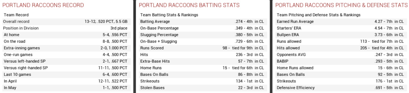 Raccoons (13-12) vs. Indians (15-8) – May 3-6, 2060 Four games with Indy now, whom the Raccoons had beaten 10-8 over the course of the previous season, but the Indians had gotten a good start and were second in the division, 2 1/2 games behind the Crusaders, who had the best record in baseball. Indy had a revived offense that sat third in runs scored, and eighth in runs allowed. Projected matchups: Bobby Herrera (1-4, 5.28 ERA) vs. Roberto Oyola (3-0, 3.45 ERA) Justin DeRose (2-2, 4.18 ERA) vs. Jarod Morris (2-1, 5.68 ERA) Zach Stewart (2-2, 5.06 ERA) vs. Melvin Guerra (2-2, 8.14 ERA) Tyler Riddle (2-0, 2.00 ERA) vs. Ben Akman (2-1, 3.42 ERA) The Coons would pick their way around the Indians’ only left-hander, Shane Fitzgibbon (2-2, 3.34 ERA) and only meet their right-handers. And they didn’t meet anybody on Monday because persistent rain washed out the opener of the series and gave us a double header for Tuesday, and headaches for further down the road. Game 1 IND: SS Kilday – CF S. Thompson – LF O. Ramos – RF Lovins – C A. Gomez – 3B R. Vargas – 1B Schaack – 2B Weber – P Oyola POR: RF Christopher – SS Lavorano – CF Caswell – 2B Nye – 1B Starr – LF Brassfield – C Maresh – 3B Benitez – P B. Herrera It would take some time to get used to an Indians lineup without Bill Quinteros, but Jason Schaack tried to make us feel less heartbroken with a single the first time through to make up for the departed contsant on-base presence of Quinteros. He was however the only batter to reach against Bobby Herrera the first time through and was stranded on base. The first six Coons went down similarly before Chris Maresh hit a leadoff single in the bottom 3rd. Benitez drew another walk, and both were bunted into scoring position by Herrera, but Joe-Chris popped out and Lonzo flew out to Steve Thompson to center. The first two were on again in the bottom 4th, with Cas and Nye singles, then two poor outs. Maresh hit a scratch single with two outs to load the bases for all .140 of Tony Benitez, who easily sailed one over to Orlando Ramos to end that inning. Bobby Herrera pitched seven shutout innings of 2-hit ball, which if there was anything to complain about it was the seven full counts he ran that led to his (relatively) early departure. He struck out seven, and he also got his pat on the bum in a scoreless game, because after the burst of on-base presence in the third and fourth innings, and a whole lotta not scoring, the Raccoons had remained silent in the fifth and sixth… and the seventh. The Coons then needed three relievers to get through the top 8th, because both Mendez and Ricky Herrera allowed a single and the Indians kept lobbing pinch-hitters at us. Ryan Sullivan got out of the inning, finally. The Raccoons then caught a break when the Indians put Raffy de la Cruz on the hill, who immediately walked Christopher to begin the bottom 8th, then served up an RBI triple into the leftfield corner to Lonzo. That was also the only run in the inning because the Raccoons completely cucked it up again with a runner on third and less than two outs. Cas whiffed, Nye popped out, Starr walked, and Brass struck out again. Worse, Matt Walters blew the lead in the ninth inning when the first four Indians all reached base on him. Orlando Ramos legged out an infield single, Chris Lovins walked, and then Alex Gomez and Ricardo Vargas hit a pair of RBI singles to flip the score before Schaack struck out and Jeff Kelly hit into a double play. In turn, Maresh’s homer in the bottom 9th tied the game and sent it to extras, where the Raccoons got to throw in a fifth reliever. That turned out to be Brad Loveless, who was on the way outta town, but hadn’t been sent down on Monday or Tuesday so far yet. He did nothing that would have saved his bacon, offering a leadoff walk in the tenth inning to Ricky Lopez, misfielding Matt Kilday’s comebacker for an error, allowed Lovins to single home the go-ahead run, and then walked Gomez to fill the bases before Vargas grounded out to strand the bases loaded. This time the Raccoons went in order in the bottom of the inning. 3-2 Indians. Maresh 3-4, HR, RBI; B. Herrera 7.0 IP, 2 H, 0 R, 0 BB, 7 K; Ack. Brad Loveless (1-1, 9.95 ERA) was made rosterless between games and the Raccoons activated Adam Harris, who had been held over as reserve for the double header just for occasions like this. Game 2 IND: SS Kilday – CF S. Thompson – LF O. Ramos – RF Lovins – 3B R. Vargas – 1B Schaack – C J. Kelly – 2B Weber – P Jar. Morris POR: RF Christopher – LF Brassfield – C Perez – 2B Nye – CF Caballero – 1B Kozak – SS Fowler – 3B Gonzales – P DeRose Portland went up 1-0 in the first in the nightcap as Christopher drew a leadoff walk from Jarod Morris, got a base on a wild pitch, another one on Brass’ single, and then scored on Angel Perez’ sac fly. The Indians then loaded the bags against DeRose in the second inning, but DeRose arrived at Jarod Morris just in time to get the third out on a lazy fly from the pitcher, and then Nick Fowler’s solo homer in the bottom 2nd extended the lead to 2-0. Third inning, third run, on a 2-out stir by Perez (single), Nye (walk), and Caballero, who singled to right, where the ball went under Lovins’ glove to allow Perez to score from second base, 3-0. The remaining runners gained an extra base, which didn’t matter once Jack Kozak barreled a 3-run homer over the fence in right, which was the first home run of his career, and one last desperate bid to save his roster spot. It also ended Morris’ day in the third inning of a 6-0 game, which the Raccoons were not unhappy to see, being down to three relievers in their own pen. Kozak hit a 2-out RBI single his next time up, driving in Nick Nye to extend the score to 7-0 in the fifth inning. At that point, our chief complaint with DeRose was the same as with Herrera earlier in the day: a lack of efficiency. He needed 86 pitches through 