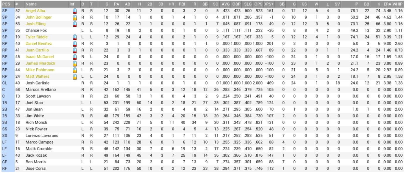 Here was another team in the gutter, and for the August Raccoons thus another trip wire. We were 4-2 against the Aces, who were bottoms in the South, and allowed the most runs in the CL. They had the worst rotation, too, which was running up a 5.09 ERA, while the pen had just shed closer Curt Carter. Projected matchups: Jeff Applegate (2-3, 2.65 ERA) vs. Justin Reif (9-9, 5.04 ERA) Angel Alba (11-9, 3.83 ERA) vs. Chris Monahan (3-13, 7.53 ERA) Chance Fox (8-6, 3.22 ERA) vs. Dan Graham (7-13, 4.70 ERA) Right, right, left, lots of high ERA’s, and we couldn’t pull runs out of our tush for our tails’ sake… Joel Starr was still day-to-day to begin the series. Game 1 POR: CF Morris – LF Crumble – SS Monck – 1B Kozak – RF Corral – 2B White – C Arellano – 3B Fowler – P Applegate LVA: C Wheat – SS Veguilla – RF K. Hummel – CF Jad. Wilson – 2B M. Roberts – LF Marazzo – 1B A. Alfaro – 3B Karch – P Reif Tom Wheat tried to take Applegate deep to lead off the bottom 1st, but Corral picked the drive off the top of the fence. Instead the first run on Monday scored on a Kozak homer to left, leading off the second inning. Corral hit a single, but was forced out by Jim White, who was then doubled up by Arellano. In the third inning the Coons not only blew the lead – mostly Applegate himself with his own throwing error on Reif’s bunt after Sean Karch hit a leadoff single. Wheat tied the game on a sac fly, but Reif was left on base by the Aces; but Malik Crumble at that point had already been ejected for arguing strike three to end the top 3rd, and had been replaced my Marco Campos. No, these remained trying times for the Raccoons, who scattered a total of five hits in the first seven innings and never got close to a run again, while Applegate held the Aces to four hits through six-and-a-third, but also offered four walks again with a parade of bad counts and was yanked after a 1-out walk to Wheat in the bottom 7th. The Dingerman got a double play grounder from Miguel Veguilla to clean up. Carrillo however gave up a leadoff gapper for a double to Ken Hummel in the bottom 8th, and conceded that run on Dustin Williams’ pinch-hit, 2-out single. Ubaldo Piteira then erased the 2-3-4 batters in 11 pitches in the ninth. 2-1 Aces. Morris 2-4, 2B; Still no Starr on Tuesday, but to be fair, aside from a battery of 6-inch howitzers going off, I didn’t see how the offense could still catch fire in the last five weeks… Game 2 POR: CF Morris – LF Crumble – 3B Monck – 1B Kozak – RF Corral – SS Lavorano – C Arellano – 2B White – P Alba LVA: LF Lorenzo – SS Veguilla – CF Jad. Wilson – RF K. Hummel – 3B A. Alfaro – 1B D. Williams – 2B M. Roberts – C Wheat – P Monahan Monahan was a woefully underdone 23-year-old rookie that was offering more walks than strikeouts this season, and it wasn’t particularly close. The Raccoons got a single, a walk, and an RBI single from Rich Monck to begin the game, then struck out twice and had Lonzo line out to Hummel to leave two on base. Another pair was frittered away in the second inning before Alex Alfaro tied the game with a homer in the bottom 2nd, however, Jose Corral answered with a 2-run homer after Monck’s leadoff single in the top 3rd. But don’t you get too giddy – Alba was looking just as *****. The 3-1 lead was scrubbed down to 3-2 in the bottom 3rd with leadoff doubles by Monahan (…) to left and Victor Lorenzo to right, and he walked the bags full with Hummel and Alex Alfaro before Williams flew out to Ben Morris to keep everybody stranded. In a 3-2 game, the Raccoons then fudged Morris and Monck singles in the fourth inning, a Lonzo double in the fifth, and another Morris single in the sixth when he was Crumbled up, 4-6-3. And despite allowing TEN hits in six innings, Monahan managed to battle Alba to a draw when the Critters’ starter densely walked two Aces in the bottom 6th, then gave up a 2-out RBI single to the ******* Two of Spades: MONAHAN. The crushable rookie even added another 1-2-3 inning in the seventh and secured himself a no-decision before David Gaither allowed leadoff singles to the 7-8 batters in the eighth inning. Joel Starr was well enough to bat for Pohlmann in the #9 spot, but hit into a fielder’s choice for an out at second base, and then Campos ran for him and stole second. The Aces answered with an intentional walk to Morris, but Crumble beat Gaither for a 2-run single to right before Monck and Kozak made meek outs. McDaniel and Carlisle would get the W over the line from there, although both issued a walk to the Aces. 5-3 Raccoons. Morris 1-2, 3 BB; Crumble 3-5, 2 RBI; Monck 2-5, RBI; Arellano 2-5, 2B; White 2-3, BB; Still no Starr on Wednesday! Game 3 POR: RF Campos – 1B Kozak – 3B Monck – LF Crumble – 2B White – SS Lavorano – CF Morris – C Lawson – P Fox LVA: LF Lorenzo – SS Veguilla – RF K. Hummel – 1B D. Williams – CF Jad. Wilson – 2B M. Roberts – C Wheat – 3B Karch – P D. Graham Kozak homered for a 1-0 lead in the first inning, but for the second time in the series, but the Aces flipped the score on Fox quite quickly. He already offered a walk to Veguilla in the first inning, but then handled Hummel’s comebacker for a 1-6-3 double play, however, a leadoff walk to Williams, Jaden Wilson’s RBI triple to center, and Mike Roberts’ sac fly to right made it 2-1 for the home team. The Raccoons then bungled another three runners across two innings before Tom Wheat’s 2-out, 3-run homer extended the Aces’ lead to 5-1 in the bottom 4th; Williams and Roberts had reached base with singles ahead of him. It didn’t get any better after that, either. Lonzo doubled home Jim White in the sixth, but in the same inning Fox got on the snout even harder when he nicked Hummel and gave up hits to Williams and Wilson. Hummel was in to score, it was 6-2 with runners on the corners and nobody out, and the Dingerman replaced Fox. Wilson was c