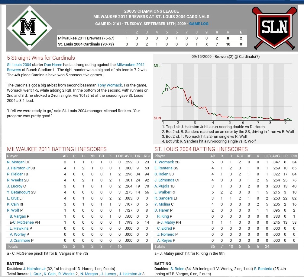 Rec/Std: 66-73, 4th, 9 GB Milwaukee W: Romero 1-1, 11.17. L: Leake 10-11, 4.86. Sv: Isringhausen 28, 3.89. HR: Pujols 13, Phillips 13. Player of the game: The Reds' Brandon Phillips was 2 for 3 with a home run, 2 runs scored and an RBI. The Cardinals' Ray Lankford was 1 for 5, but his double in the sixth inning snapped a 2-2 tie. |