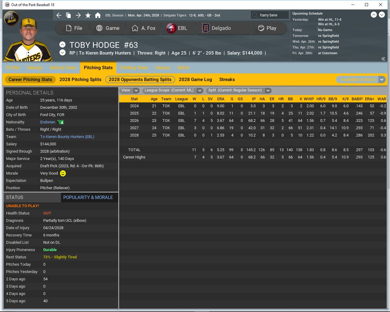 To Kieren will miss RP Toby Hodge for the rest of the season. Las Vegas loses RF Oscar Tavares for the rest of the season. White Sox will miss 3B Arturo Guzman for 3-4 weeks & lose Cf Alejandro Mendez for 4 weeks.