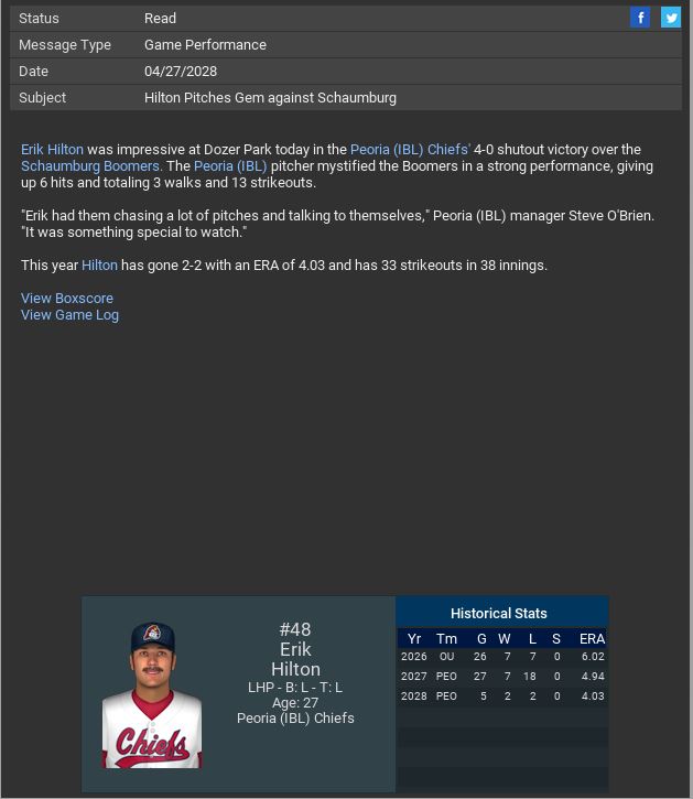 Peoria (IBL) SP Erik Hilton pitched a CG SH with 13 K's.