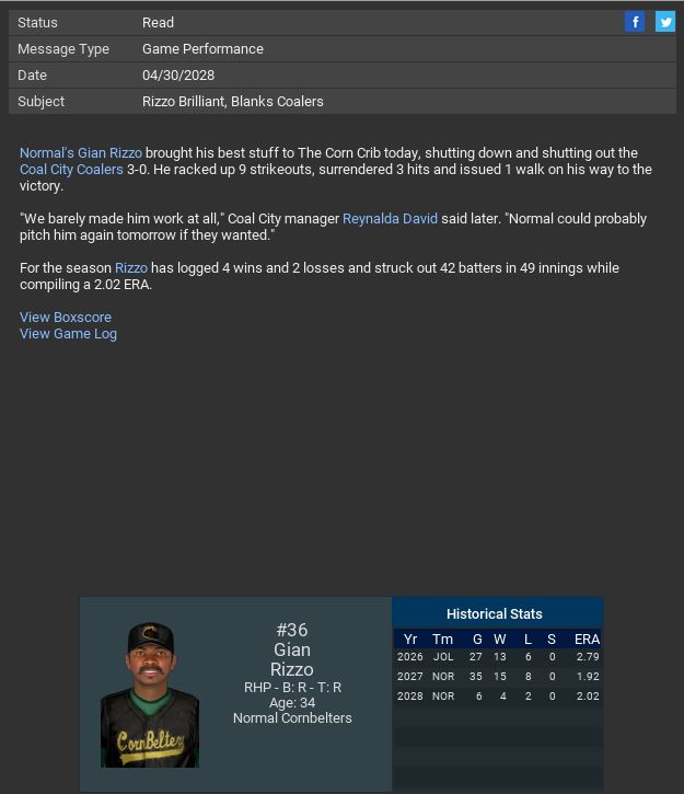 Nationals lose SP Rich Collins for 4 months. Racers SP Manuel Gutierrez pitched a CG SH. Fire SP Allen Miller pitched a CG SH. Normal SP Gian Rizzo K'd 10 Boomers in a CG SH.