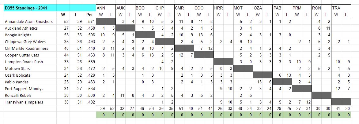 Remember yesterday? When eight of the ten top records in the league belonged to OL teams? Well, no more. Only five OL teams make the playoffs and three of those (Southpaws, Cottons, and Lagers) are in as wild cards. One team that had a disastrous day was the Energizer Bunnies. At one point yesterday, they had a seven game lead in their division with a 98% chance of making the playoffs. That chance was squandered in their 163rd game and they will spend the playoffs watching TV. The Syrups and Mokes also took dives.