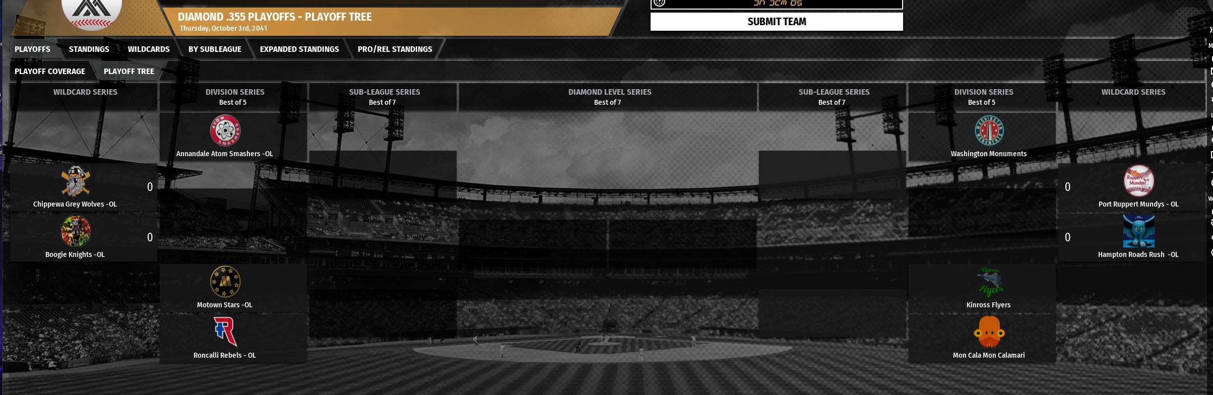 In other league news, they playoff tree is attached. Terra Incognita and San Pedro played a game 163 to decide the second wild card in the NC, with the Cerrano losing a 4-0 lead late, then tying the game in the top of the 9th, before falling in the bottom of the final frame, 6-5. The Seattle Raniers will be headed to bronze next year. At least three teams will be going to gold. |