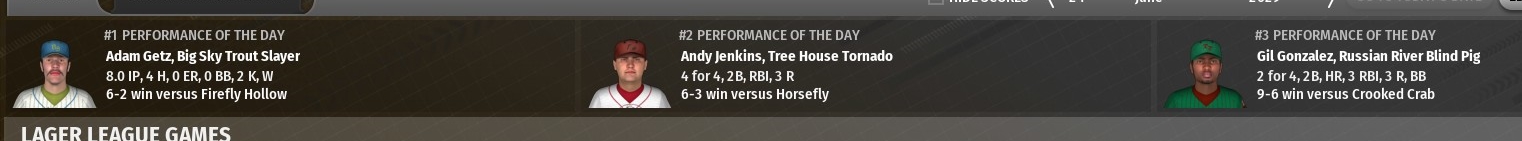 Lager League - Pilsner Division: Weyerbacher Blithering Idiot - a solid 17-9 month of June has the Blithering Idiot in front with a 7 game lead. Starter Danny Ibarra has already matched his career high in wins with 10. The team overall is humming along with the top ranked offense (1st in runs scored at 421) and 3rd ranked in runs against with 309. Lager League - Kolsch Division: Goose Island Goslings - after a dismal start in April (8-15), Goose Island has done a complete 180, going 19-9 in May and 20-5 in June to take control of the division with an 11 game lead (largest lead in the league). Rookie starter Jonathan Wallace (7-3, 2.16 ERA) has already settled in to the ace role, and veteran starter turned closer Amine Brisset (27 saves, 1.61 ERA) is providing a solid hammer at the end, as the Goslings look for their first ever division crown. Lager League - Helles Division: Big Sky Trout Slayer - in the tightest division in the league (6 games separate first from last), Big Sky holds down the top spot, but by a mere 1 game. A current 4 game losing streak has them on the verge of slipping back a spot. If the team can get a lead into the final innings, closer Danny Villarreal (19 saves, 1.98 ERA) is doing his part to finish it off. Lager League - Tripel Division: Texas Leaguer Chin Music - despite a mediocre month of June (13-13), Texas Leaguer still holds down the top spot in the division, as the other four teams are at .500 or below. Left fielder Jim Nyseth (7 home runs, 47 RBIs, .312 average) and center fielder Danny Amador (9 home runs, 45 RBIs, .297 average) are doing the heavy lifting for the offense; as six of the other regulars are only batting .230 or lower. Stout League - Porter Division: Crooked Crab Furious George - even though they have a BCS title in their resume, Crooked Crab has yet to win the division (they were a wild card team that finished 3rd in the division during their championship run); so fans are extra pumped this season to see their club atop the standings with a 5 game lead. Catcher Roberto Garcia, while only appearing in half of the team's games so far this season, is batting an impressive .390 to this point (50 points higher than any single season best in his 10 year career). Stout League - Dunkel Division: Jester King Das Wunderkind - a six game losing streak has Jester King perilously close to dropping from the top, as their division lead is a razor thin half game. While they have a top notch offense (top ranked in runs scored at 447), they also give up runs at a tremendous rate (16th ranked in runs against at 366). Stout League - Eisbock Division: Russian River Blind Pig - seeking their second BCS title, the Blind Pig are powering their way through the league this season (top ranked in home runs with 101). Slugger Rico Mendieta is leading the club in that category with 26 round trippers already. He currently has 344 career home runs, ranking second just 1 blast behind Pablo Landeros. Stout League - Altbier Division: Toboggan Lunatic Fridge - a solid 20-7 month, and a 9 game winning streak has Toboggan atop the division with a 10.5 game lead. Veteran starter and all-time wins leader (164) Bobby Rodriguez is performing as expected with a 9-1 record and 3.40 ERA. The team offense is humming along as well, with the top rank in batting average (.295), on base percentage (.358), OPS (.783), batting WAR (19.2), wOBA (.344), and base running (+16.9). |