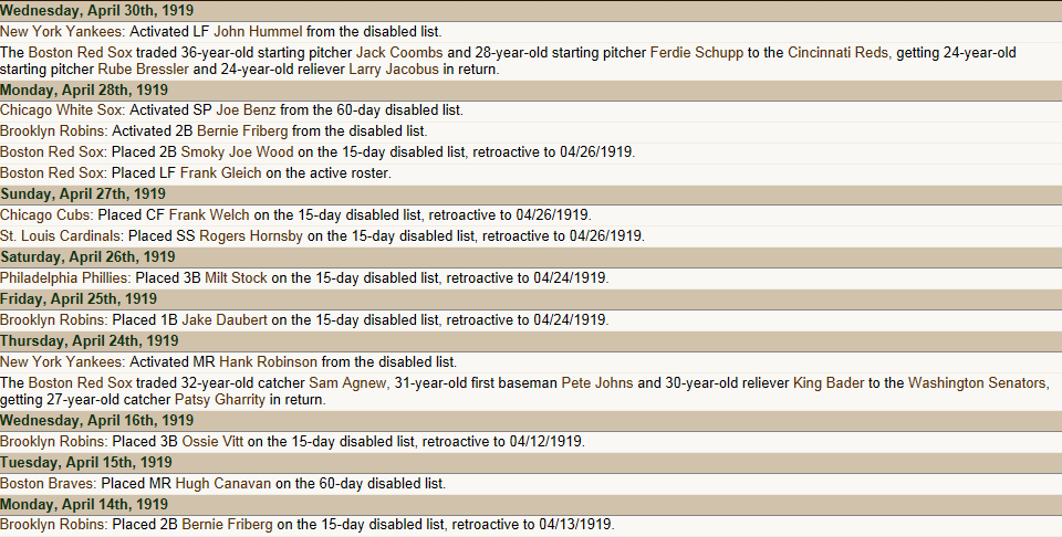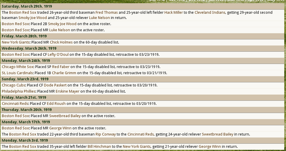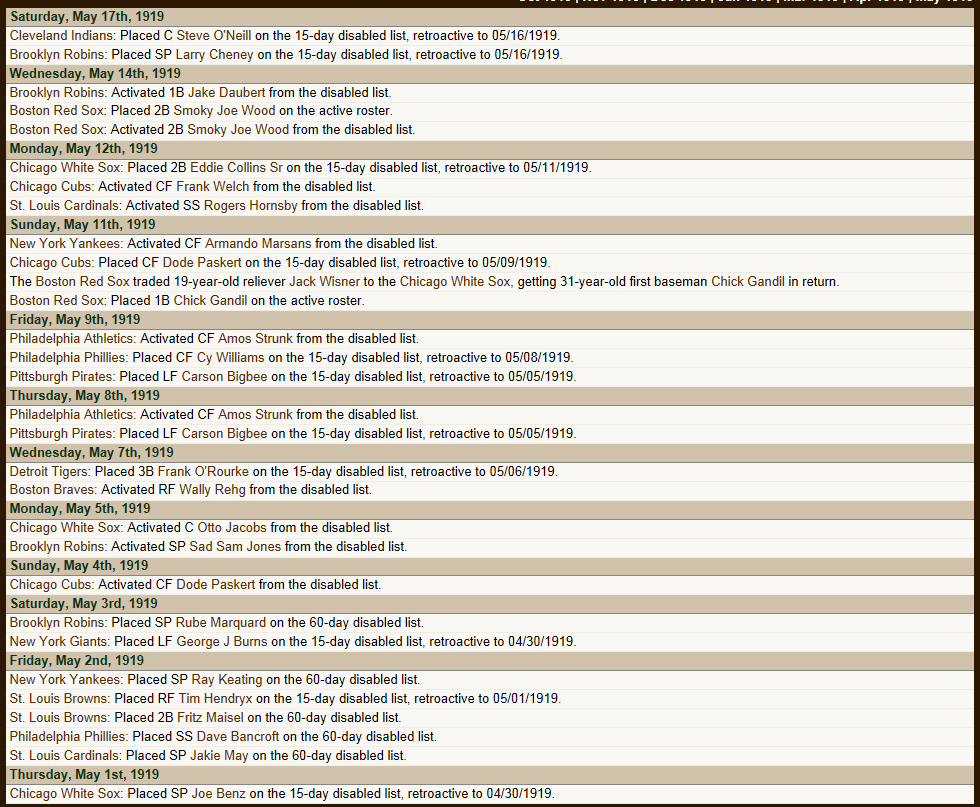 Chick Gandil changes his Sox! ![]() The Chicago White Sox have had had Chick Gandil on the trade Block since mid-way threw last season when they acquired Herry Heilman via Trade with Detroit. Boston Red Sox have been searching for a right handed Bat off the bench and a quality player to back up Stuffy McInnis since the departure of Bill Hinchman. They got both today when Chicago agreed to deal Gandil for 19 year old Rookie Pitcher (#47 Prospect) Jack Wisner. Wisner pitched well enough to make alot of teams in spring but with the depth at MR Boston has he started the year on the reserve squad.
