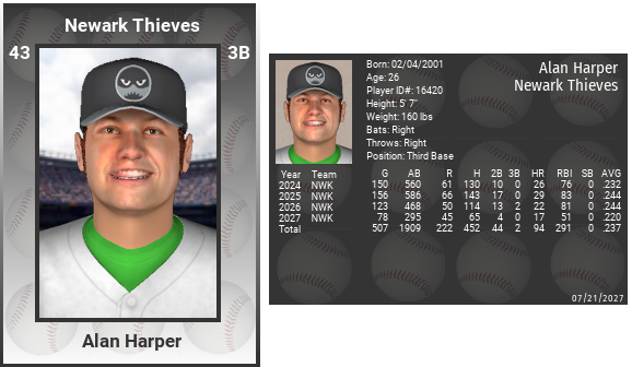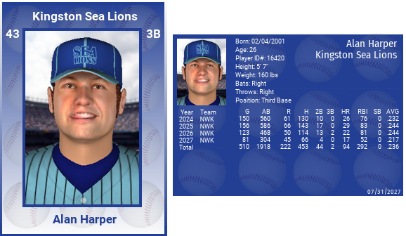 National League awarded player of the week to San Bernardino Butchers outfielder Dave Henderson. Hendu hit a spectacular 8 homers and 22 RBI's in one week while going 19 for 32. He has 41 homers and 113 RBI's to day and San Bernardino is 64-56 on the season. The Grand Rapids Crawdads traded for school teacher and sweathog Gabe Kotter today from the Anchorage Bears while sending RP Barry Cort to Anchorage. Kotter will report to AAA Gering, even though he is a light stick he drove in 101 runs with 1 homer in AAA ball in 2026 for Anchorage. The NL East Leading Brooklyn Brawlers made a strange move by dealing centerfielder Roberto Kelly and RF Scott Hastings to the Santo Domingo Oceanics for RP Mashiro Tanaka and RP Ryan Rupe. Kelly drove in 101 runs in 2026 for Brooklyn and was decent in 2027. Tanaka was 8-3 out of the Santo Domingo pen this year but had a 4.80 ERA and Brooklyn will use him also as a reliever. Johnny Pesky had a huge day today hitting for the cycle as his Colorado Rockies devoured the Boca Raton Gold Sox at home. Peskey scores 4 runs and drives in 2 to lead the attack. Chris Brown (the 3rd baseman) hit a grand slam in the game as well. The Texas Rangers have lost RP Don Hankins for the season with a torn flexor tendon in his elbow. Hankins was 4-1 out of the pen this year David Jaeger has been traded by the Eugene Swashbucklers to the Delaware Big Train in exchange for 2B Benny Bowcock. Jaeger had 17 homers this year for Eugene. The San Diego Padres are not in contention but they still added closer Matt Lindstrom today in a trade with the Lagos Hammerheads. Lagos gets back fabled 1B Wally Pipp and CF Braulio Castillo.. Lindstrom had 16 saves and a 3.20 ERA this year for Lagos. Kevin Seitzer is 38 years old but that did not stop the Cozumel Scouts from making a trade to get his services from the Norfolk Zips. Norfolk gets back in the trade CF Dave Schneck and RP Willis Roberts. Seitzer was hitting .255 with 40 RBI's for Norfolk. Cozumel is in 3rd place in the NL Tropical division just 3 games behind the first place Tijuana Pelicans. The Birmingham Hillcats acquired infielder Tony Taylor from the Flint Bearcats in exchange for RP Andy Lapihuska and RP Denys Baez. Taylor was hitting .253 for Flint HIshashi Iwakuma has been dealt by the Beijing Airhogs to the Oakland Athletics with Beijing getting back 1B Joey Meyer. Iwakuma was 5-10 for Beijing and joins Oakland who are in 3rd place in the AL Pacific trailing the Fresno Bashers by 6 games. In a surprising move the Philadelphia Phillies dealt CF Bob Allison to their division rivals the Washington Nationals today along with outfielder Preston Tucker for the services of C Lew Brown. Allison had 37 homers this year and had 52 in 2026. Brown is a decent hitting catcher with 18 homers and a .264 average. Phillies are in first place in the NL Atlantic and Washington is in 3rd place 10 games out. The Brooklyn Brawlers remained busy trading for reliever Pablo Torrealba from the Syracuse Maroons today. They give up to Syracuse, C Hank Riebe and RP Kyle Kendric. Torrealba had 67 saves in 2024 and 2025 for Syracuse but has tapered off. Don Johnson (the infielder, not actor) was sent today to the Santa Fe Impact by the Lincoln Music with Lincoln returning back RP Chad Orvella The Dublin Outlaws are contending in the AL World Division and added 36 year old third baseman Roy Hartzell in a trade today with the Cape Cod Manatees along with C Ike Hampton. Cape Cod receives SS Red Roberts and RP Williams Perez. Hartzell was batting .275 for Cape Cod, Dublin is in 3rd place in the AL World Division and just 5 games behind division leading Tokyo Alligators. A bit of sacrireligion as the New York Yankees add by trade Catcher Paul LoDuca from the Honolulu Riptide today in a trade for RP Tony Gonsolin and 1B Joseph Knight. LoDuca had 11 homers for Honolulu this year which is chasing the Los Angeles Dodgers for first place in the NL Pacific as they trail by only 4 games but must feel confident in starting catcher Gary Alexander. |