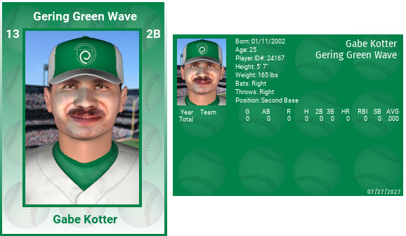 American League Player of the Week goes to Dublin Outlaws rookie outfielder George Gore. Gore goes 12 for 17 while hitting 3 homers and driving in 11 runs. He has hit 33 homers and has driven in 95 runs this year for Dublin who are tied for 2nd in the AL World Division and 6 games behind the first place Tokyo Alligators Dude Esterbrook of the Jones Beach Jets wins the NL Player of the Week award as he slugs 8 homers and drives in 12 runs while going 15 for 26 in a monstrous week. Esterbrook has torn the cover off the ball for Jones Beach with 46 homers, 119 RBI's and a .332 average. Jones Beach has hung in the NL East race in 5th place 9 games behind both the Brooklyn Brawlers and New York Mets. Esterbrook is an odd case study as he just hit 13 homers for the mighty Memphis Cougars in his first 4 years and has 147 homers in 4 seasons off Ocean Parkway. Newly acquired Bill O'Hara of the Tijuana Pelicans is now out for the season with a broken kneecap. He had 13 homers for Tijuana and his former team the Guadalajara Bighorns. Tijuana is clinging to a 2 game lead in the NL Tropical Division over the Key West Condors. The injury occurred in a 10-5 road loss to the St Louis Cardinals at Busch Stadium at a collision at 2nd base with Cardinals SS Carlos Guillen. Miami Marlins slugging first baseman Hal Trosky hit his 400th career homer today as the Marlins torched the Tahiti River Sharks 10-2 on the road at Moorea Stadium. Trosky hit his 38th homer of the season off of Joe Edelen in the 9th inning to make it 400 for his career all with the Marlins. Joc Pederson hit 2 homers and drove in 4 runs for Miami in the win. Frankie Frisch had a huge 5 hit game today for the Redding Missions as they destroyed the Santa Fe Impact 11-1 on the road at Aggie Park. Frisch goes 5 for 6 and drives in 3 runs and is hitting .269 in his rookie season. Dick Newsome pitched 5 strong innings to get the win for Redding. The San Jose Skeeters have been a mess all year as they watch first year teams outperform them. Ty Cobb went to Pied Piper the ownership company of San Jose and demanded the heads of the GM and Manager after the trade for the controversial Rudy Guiliani. Ownership decided to fire the GM Nate Proctor and Manager Roman Faulkner. Given the odd situation there, no one wanted the job so they found two guys in the mail room and made them GM and Manager. Jose Tena from Jackson, MI was pulled out of the tech department to be the new general manager and their manager becomes Gregg Clark who is a Centennial, Colorado man who really just works in the mail room. |
