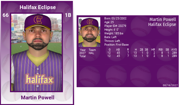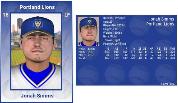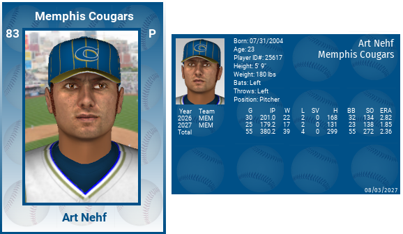 Roman Laureano celebrated a big day today for the Saskatoon Beavers hitting his 300th career homer. Saskatoon lost the game at home 8-7 to the Tucson Tomahawks but Laureano hit his 33rd homer of the year in the first inning off of Watty Lee to hit the milestone marker. Laureano hit 45 homers in 2025 for Saskatoon and hit 179 homers with the New Orleans Zebras before coming to Saskatoon. Jason Heyward hit a 3 run double in the top of the 9th to break the tie in this game and give Tucson the win. The NL Central leading Philadelphia Phillies suffered a tough blow losing SP Ed Walsh for the season with shoulder inflammation. Walsh was 11-4 with a 1.93 ERA in his rookie campaign. Walsh suffered the injury in an 8-5 home loss to the rival Atlanta Braves. Utah Saints rookie first baseman slammed 3 homers in a game today as the AL West leading Utah squad thrashed the 2nd place Texas Rangers 14-3 at Globe Life Park. Pete Donohue of the Philadelphia Phillies hurled a 5 hit shutout today over the Atlanta Braves as he fanned 8 and walked 1. Donohue spent 8 years with the Cincinnati Reds before coming to Philly this year and had not been as effective for Philadelphia with a 10-6 record and 3.50 ERA. Johnny Grubb and Don Lang had 2 run shots in the game for Philadelphia. The Van Nuys Arrows destroyed the Cape Cod Manatees on the road at Kennedy Stadium 27-9 today. The game saw Cory Snyder go 5 for 6 with 3 RBI's, including hitting his 50th homer of the year. Roger Connor and Austin McHenry each drove in 5 runs for Van Nuys. |
