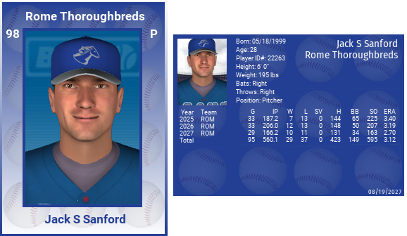 The 11th no hitter of the 2027 season has been tossed by David Palmer of the Billings Beacons as they triumphed over the Hartford Rocketmen on the road at Aetna Stadium. Palmer fanned 14 batters in the game and walked 3 to get the big no hitter. (Much like real life Palmer is not a great pitcher at 3-9 this year, but he threw a no hitter in the 1980's for the Expos).