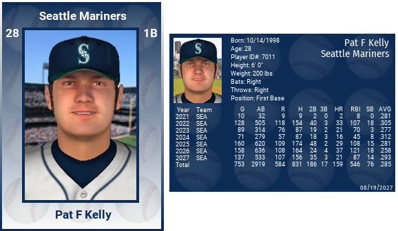 National League Player of the Week goes to Elmer Smith of the New Orleans Zebras. Smith went wild driving in 24 runs in one week with 8 homers and a .515 batting average. He suddenly has 156 RBI's in 2027. Arizona Diamondbacks rightfielder Glenallen Hill had a big 6 hits game today as the D-Back trounced the Van Nuys Arrows in Narley Stadium 36-2. Hill goes 6 for 7 with 3 RBI's and is his hitting .472 in limited duty. Raul Mondesi Jr drove in 9 runs while Bob Bescher knocked in 7. Geronimo Pena crossed the plate 8 times as Van Nuys wished there was a mercy rule. Arizona is in 3rd place in the NL West trailing the first place Las Vegas Snake Eyes by 6 games. It was a huge day for Pittsburgh Pirates slugger Ralph Kiner as he hit his 300th career blast in a game today that the Bucs won at home 6-4 over the Austin Donkeys. Kiner hit a 2 run shot in the first inning off of Zane Smith of Austin. Hanley Ramirez lead the way with 3 hits and 3 RBI's in the victory. Kiner has hit all 300 homers as a member of the Pirates (editor's note: he was organically drafted at random by Pittsburgh) Yukon Drillers lefthander Chuck Finley will retire at the end of the year at 38 years old. Finley has been stuck at AAA for Yukon and just got called up for the expanded rosters. He won 18 games in 2021 for the New York Yankees. Also in retirement news, Myrtle Beach Rage pitcher Colin McHugh will call it a day at 37 years old. He was 3-19 this year for Myrtle Beach with an 8.52 ERA. His best year was 2019 with the Minnesota Twins with 12 wins. The Yukon Drillers learned that they have lost RP Harry Suter for the year with a damaged elbow ligament. Suter was 2-5 this year in the hinterlands. |