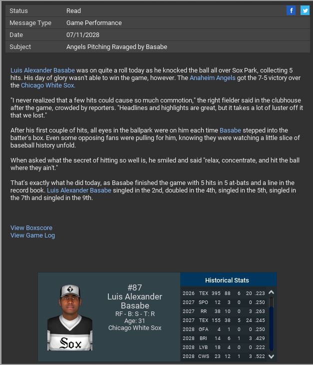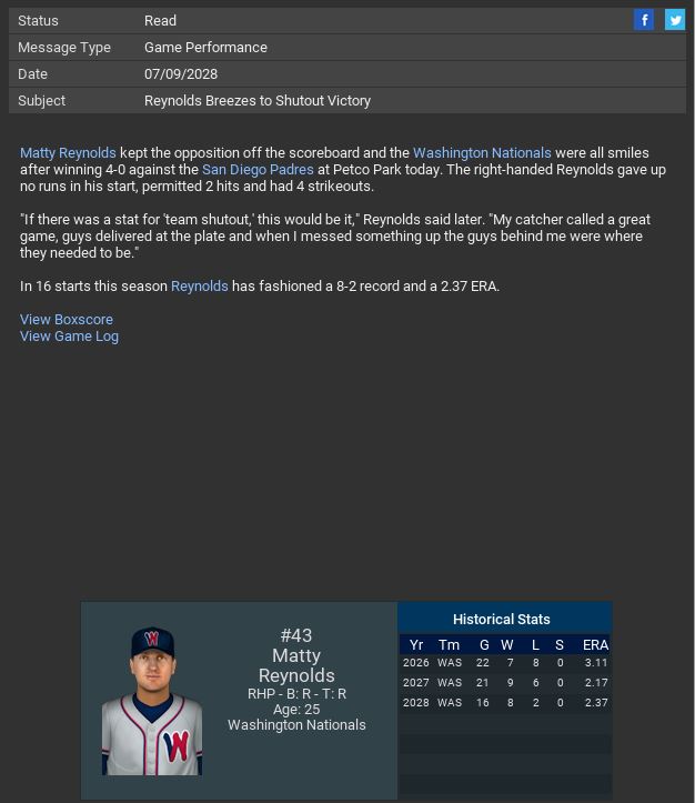 Nats SP Matty Reynolds pitched a 2 Hit CG SH. Minnesota Twins traded Rf Zack Morris & $30,000 to the Charlotte Knights for a minor league P. Twins also traded SP Ray Lawlor & $280,000 to the Charlotte Knights for a minor league 2B. Havana Sugar Kings traded RP Yuki Sugiyama & $840,000 to the Corvair Corvettes for a minor league 2B.