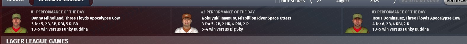 27 Aug 2029: Gold beer award: Danny Milholland of Three Floyds Apocalypse Cow - Milholland went 5-for-5 with a double, a triple, one RBI and 5 runs scored in a 13-5 win over Funky Buddha Huki Idol Silver beer award: Nobuyuki Imamura of Mispillion River Space Otters - Imamura went 3-for-5 with a double, 2 home runs, 4 RBIs and 2 runs scored in a 5-4 win over Big Sky Trout Slayer Bronze beer award: Jesus Dominguez of Three Floyds Apocalypse Cow - Dominguez went 4-for-6 with a double, 4 RBIs and 2 runs scored in a 13-5 win over Funky Buddha other scores from around the league: -Tree House Tornado defeat Twisted X Chupahopra 4-1 in 11 innings -Firefly Hollow Dire Chinchilla defeat Scorched Earth Giant Killer 4-3 -Waikiki Ala Moana defeat Texas Leaguer Chin Music 9-3 -Daft Badger Hoppypotamus defeat Boulder Killer Penguin 1-0 -Chafunkta Kingfish defeat Crooked Crab Furious George 3-1 -Jester King Das Wunderkind defeat Terrapin Hopsecutioner 7-1 -Tattered Flag Man of War defeat Four Hands Typhon 4-3 -Russian River Blind Pig defeat Thimble Island Kraken 6-4 in 11 innings -Kona Pipeline defeat Odious Cellars Rubied Perspective 3-2 -Prairie Sun Mad Hopper defeat Smog City Sabre Toothed Squirrels 5-4 in 13 innings -Stony Creek Crankenstein defeat Rabid Dwarves of Doom 5-4 -Palmetto Ghost Rider defeat Sleeping Giant Beaver Duck 5-4 in 12 innings -Red Rock Elephino defeat Toboggan Lunatic Fridge 6-3 -Weyerbacher Blithering Idiot defeat Sierra Nevada Narwhals 6-5 in 12 innings -Meadowlark Mob Barley defeat Ballast Point Commodores 6-2 -Foulmouthed Malcontent defeat Laughing Sun Red Dwarf 7-5 in 11 innings -Charleville Half Wits defeat Goose Island Goslings 3-2 -Great Raft Reasonably Corrupt defeat Horsefly Jazzy Razzy 2-1 |
