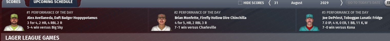 29 Aug 2029: Gold beer award: John Bargender of Palmetto Ghost Rider - Bargender went 3-for-3 with a double, a home run, 2 RBIs and 3 runs scored in a 9-1 win over Sleeping Giant Beaver Duck Silver beer award: Bobby Antonio of Sierra Nevada Narwhals - Antonio went 9 innings, giving up 5 hits and no runs with no walks and 4 strikeouts in an 11-0 win over Horsefly Jazzy Razzy Bronze beer award: Mario Lemus of Russian River Blind Pig - Lemus went 7 innings, giving up 3 hits and no runs with 2 walks and 11 strikeouts in a 1-0 loss to Thimble Island Kraken other scores from around the league: -Charleville Half Wits defeat Firefly Hollow Dire Chinchilla 3-2 -Scorched Earth Giant Killer defeat Texas Leaguer Chin Music 5-1 -Twisted X Chupahopra defeat Mispillion River Space Otters 7-1 -Ballast Point Commodores defeat Great Raft Reasonably Corrupt 7-2 -Waikiki Ala Moana defeat Boulder Killer Penguin 1-0 -Tattered Flag Man of War defeat Four Hands Typhon 4-1 -Three Floyds Apocalypse Cow defeat Funky Buddha Huki Idol 6-5 -Jester King Das Wunderkind defeat Terrapin Hopsecutioner 2-1 -Chafunkta Kingfish defeat Crooked Crab Furious George 3-1 in 11 innings -Odious Cellars Rubied Perspective defeat Kona Pipeline 4-3 -Smog City Sabre Toothed Squirrels defeat Prairie Sun Mad Hopper 4-3 -Stony Creek Crankenstein defeat Rabid Dwarves of Doom 6-1 -Red Rock Elephino defeat Toboggan Lunatic Fridge 10-1 -Foulmouthed Malcontent defeat Tree House Tornado 6-0 -Daft Badger Hoppypotamus defeat Big Sky Trout Slayer 7-1 -Laughing Sun Red Dwarf defeat Meadowlark Mob Barley 9-1 -Goose Island Goslings defeat Weyerbacher Blithering Idiot 8-0 |