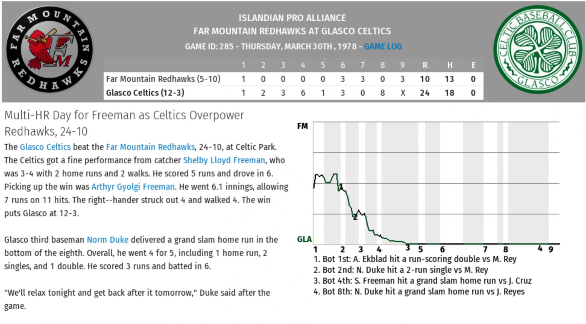Would also like to see how the new rivals of the Freeman Family are each faring with their respective teams at least once a month, of course, as well. Hope to see reports on them periodically, for sure, over at least the next few seasons, if possible, jg2977. CD out.