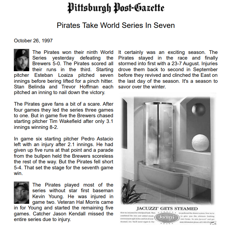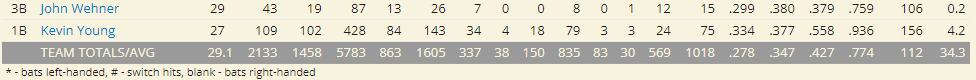 It's a peculiar situation. This is five years into the Pirates 20 year streak of losing seasons and due to me playing historical rookies the team is loaded with real life Pirates. Here's the World Series team. Seventeen real life Pirates.
