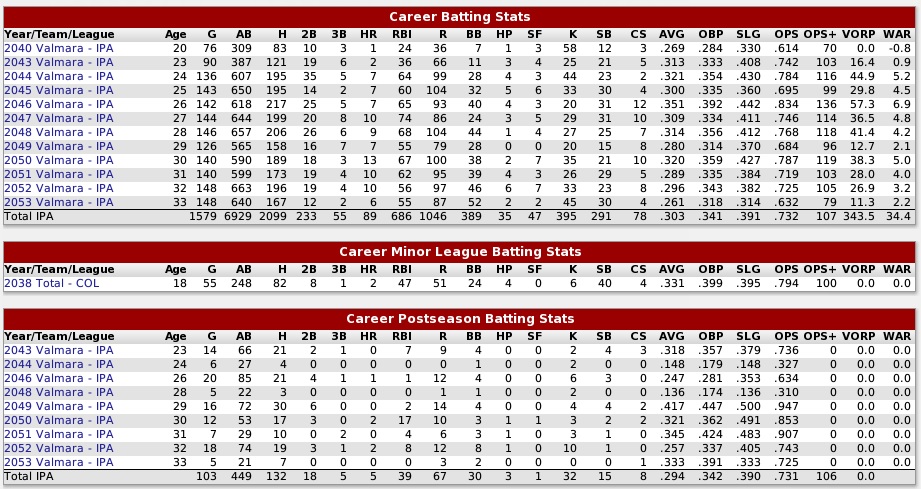 Monday, April 6, 2054 Islandian Pro Alliance Fifth All-Decade Team (2041-2050) C: Corky DiNozzo (2035-2053) One of the best backstops of all time in the IPA... DiNozzo was a 13-time Tycobbian All-Star for the Kenwood Wildcats... he was the Rookie of the Year in 2035... won the TU Most Valuable Player Award in 2048, along with the Golden Bat for that year... led Kenwood to 6 TU West Division pennants... DiNozzo batted .313 for his career, drove in 1744 runs and ranked 5th all-time in homers with 635... no catcher had more roundtrippers than him... in the playoffs DiNozzo hit .268 in 38 games with 9 homers and 26 RBIs... never won a Pro Cup ring... played for 19 years... retired at the end of the 2053 season at age 37... still quite a hitter... batted .277 his final season with 17 homers and 78 RBIs in 117 games... DiNozzi was the overwhelming choice for the best catcher in the 40s... no one came close to his stats in the decade. Other distant contenders for the All-Decade catcher were Filipe Zamora and Ryan Nelms... Zamora played 13 seasons for the San Alejo Montaneros, finished with a .299 BA, 322 home runs and 1170 RBIs... From 2041 to 2045 Zamora even outperformed DiNozzo, but he declined rapidly after that and retired two years later at 36... 6-time All-Star... Zamora played very well in the postseason, appeared in 29 games with 6 HRs and 27 RBIs and a .287 BA, but did not win a Pro Cup trophy... at 35 Nelms is still an active player in his 10th season with the Taranto Tars... he is a 4-time All-Star and Golden Glover... career average at .261 with 432 homers and 1093 RBIs...Nelms has never played in the playoffs. Last edited by Eugene Church; 10-06-2015 at 05:26 PM. |